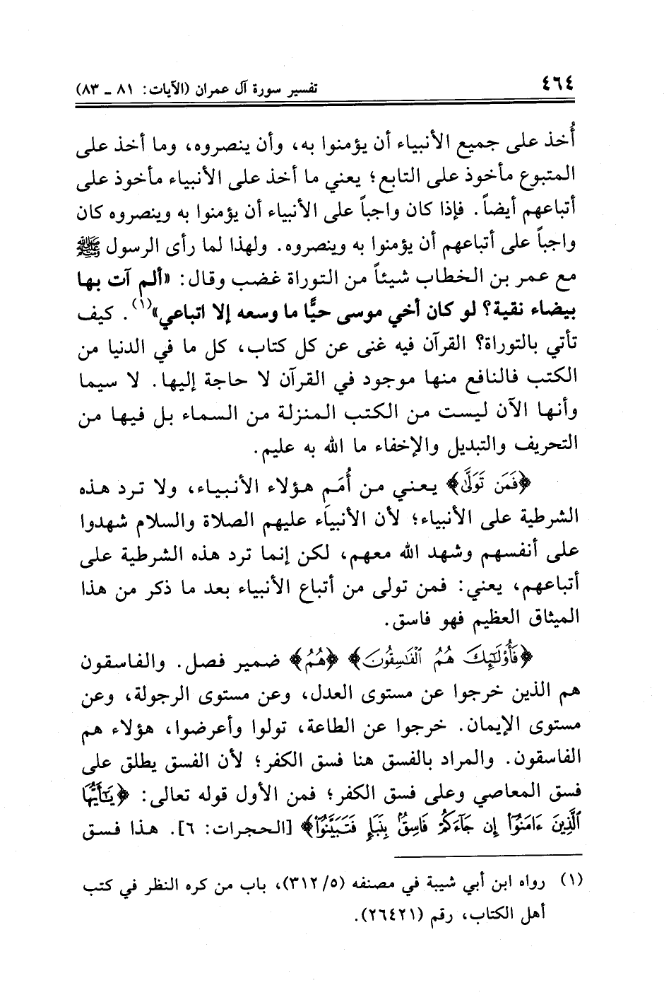 أُخذ على جميع الأنبياء أن يؤمنوا به، وأن ينصروه، وما أخذ على المتبوع مأخوذ على التابع؛ يعني ما أخذ على الأنبياء مأخوذ على أتباعهم أيضًا. فإذا كان واجبًا على الأنبياء أن يؤمنوا به وينصروه كان واجبًا على أتباعهم أن يؤمنوا به وينصروه. ولهذا لما رأى الرسول - صلى الله عليه وسلم - مع عمر بن الخطاب شيئًا من التوراة غضب وقال: "ألم آت بها بيضاء نقية؟ لو كان أخي موسى حيًّا ما وسعه إلا اتباعي" (¬١). كيف تأتي بالتوراة؟ القرآن فيه غنى عن كل كتاب، كل ما في الدنيا من الكتب فالنافع منها موجود في القرآن لا حاجة إليها. لاسيما وأنها الآن ليست من الكتب المنزلة من السماء بل فيها من التحريف والتبديل والإخفاء ما الله به عليم.