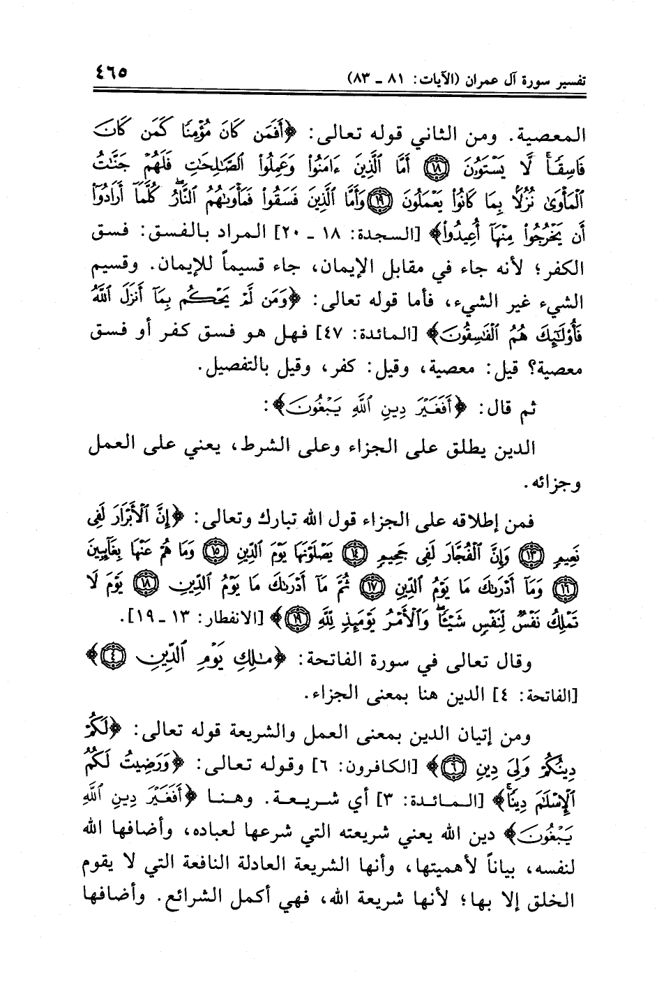 ومن إتيان الدين بمعنى العمل والشريعة قوله تعالى: {لَكُمْ دِينُكُمْ وَلِيَ دِينِ (٦)} [الكافرون: ٦] وقوله تعالى: {وَرَضِيتُ لَكُمُ الْإِسْلَامَ دِينًا} [المائدة: ٣] أي شريعة. وهنا {أَفَغَيْرَ دِينِ اللَّهِ يَبْغُونَ} دين الله يعني شريعته التي شرعها لعباده، وأضافها الله لنفسه، بيانًا لأهميتها، وأنها الشريعة العادلة النافعة التي لا يقوم الخلق إلا بها؛ لأنها شريعة الله، فهي أكمل الشرائع. وأضافها
