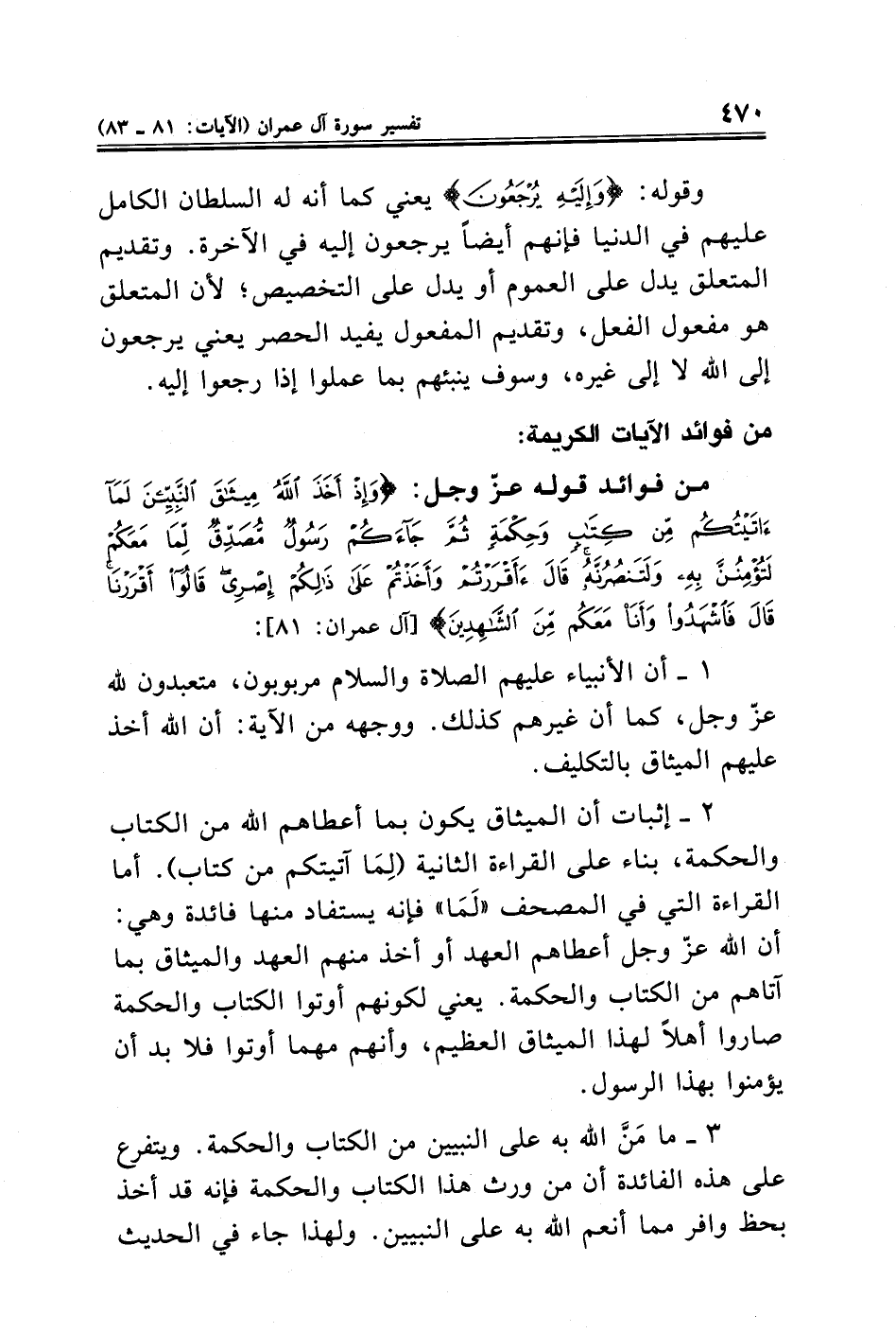 ٢ - إثبات أن الميثاق يكون بما أعطاهم الله من الكتاب والحكمة، بناء على القراءة الثانية (لِمَا آتيتكم من كتاب). أما القراءة التي في المصحف "لَمَا" فإنه يستفاد منها فائدة وهي: أن الله عزّ وجل أعطاهم العهد أو أخذ منهم العهد والميثاق بما آتاهم من الكتاب والحكمة. يعني لكونهم أوتوا الكتاب والحكمة صاروا أهلًا لهذا الميثاق العظيم، وأنهم مهما أوتوا فلابد أن يؤمنوا بهذا الرسول.