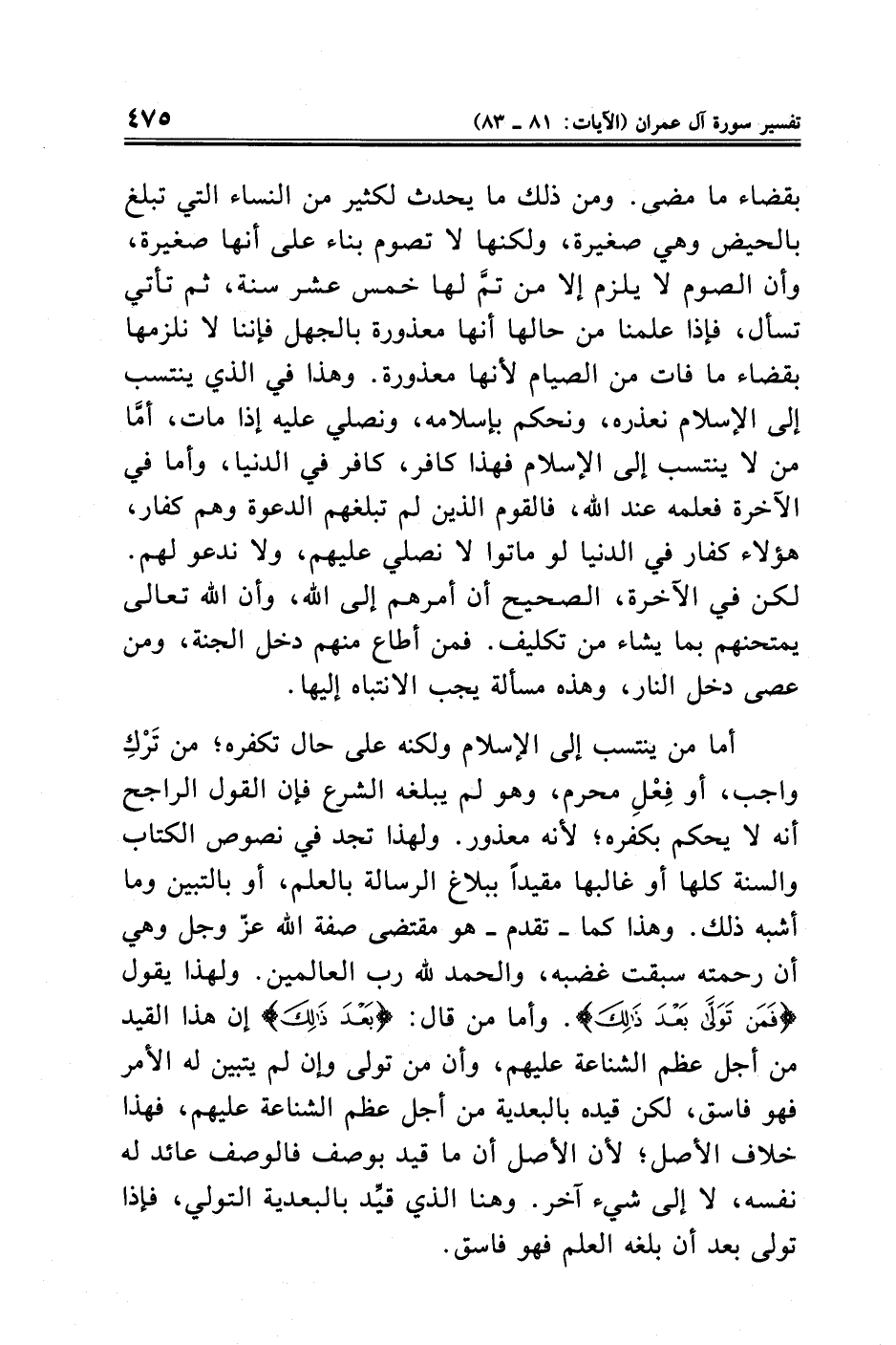 أما من ينتسب إلى الإسلام ولكنه على حال تكفره؛ من تَرْكِ واجب، أو فِعْلِ محرم، وهو لم يبلغه الشرع فإن القول الراجح أنه لا يحكم بكفره؛ لأنه معذور. ولهذا تجد في نصوص الكتاب والسنة كلها أو غالبها مقيدًا ببلاغ الرسالة بالعلم، أو بالتبين وما أشبه ذلك. وهذا كما قلت لكم هو مقتضى صفة الله عزّ وجل وهي أن رحمته سبقت غضبه، والحمد لله رب العالمين. ولهذا يقول {فَمَنْ تَوَلَّى بَعْدَ ذَلِكَ}. وأما من قال: {بَعْدَ ذَلِكَ} إن هذا القيد من أجل عظم الشناعة عليهم، وأن من تولى وإن لم يتبين له الأمر فهو فاسق، لكن قيده بالبعدية من أجل عظم الشناعة عليهم، فهذا خلاف الأصل؛ لأن الأصل أن ما قيد بوصف فالوصف عائد له نفسه، لا إلى شيء آخر. وهنا الذي قيِّد بالبعدية التولي، فإذا تولى بعد أن بلغه العلم فهو فاسق.