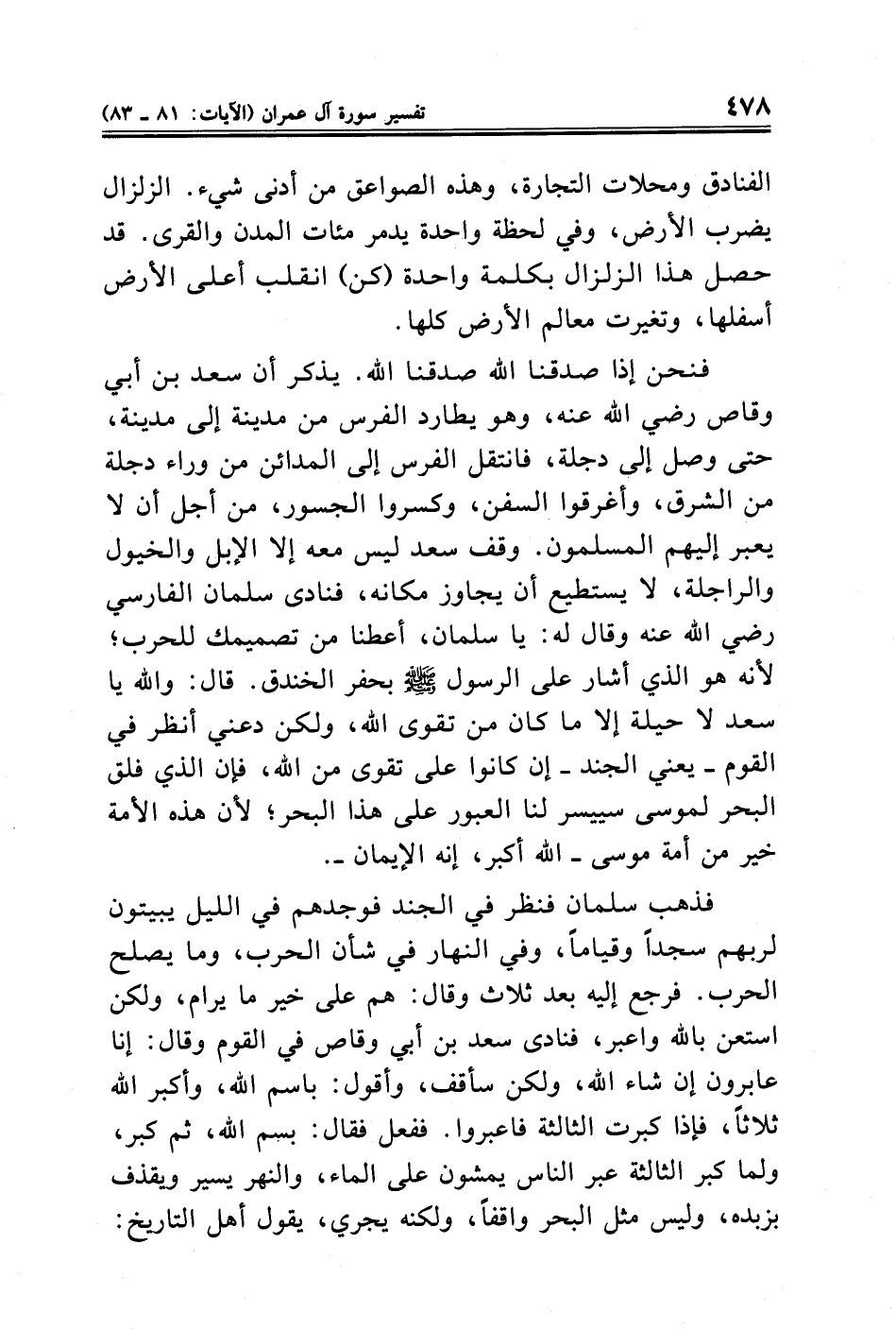 فذهب سلمان فنظر في الجند فوجدهم في الليل يبيتون لربهم سجدًا وقيامًا، وفي النهار في شأن الحرب، وما يصلح الحرب. فرجع إليه بعد ثلاث وقال: هم على خير ما يرام، ولكن استعن بالله واعبر، فنادى سعد بن أبي وقاص في القوم وقال: إنا عابرون إن شاء الله، ولكن سأقف، وأقول: باسم الله، وأكبر الله ثلاثًا، فإذا كبرت الثالثة فاعبروا. ففعل فقال: بسم الله، ثم كبر، ولما كبر الثالثة عبر الناس يمشون على الماء، والنهر يسير ويقذف بزبده، وليس مثل البحر واقفًا، ولكنه يجري، يقول أهل التاريخ: