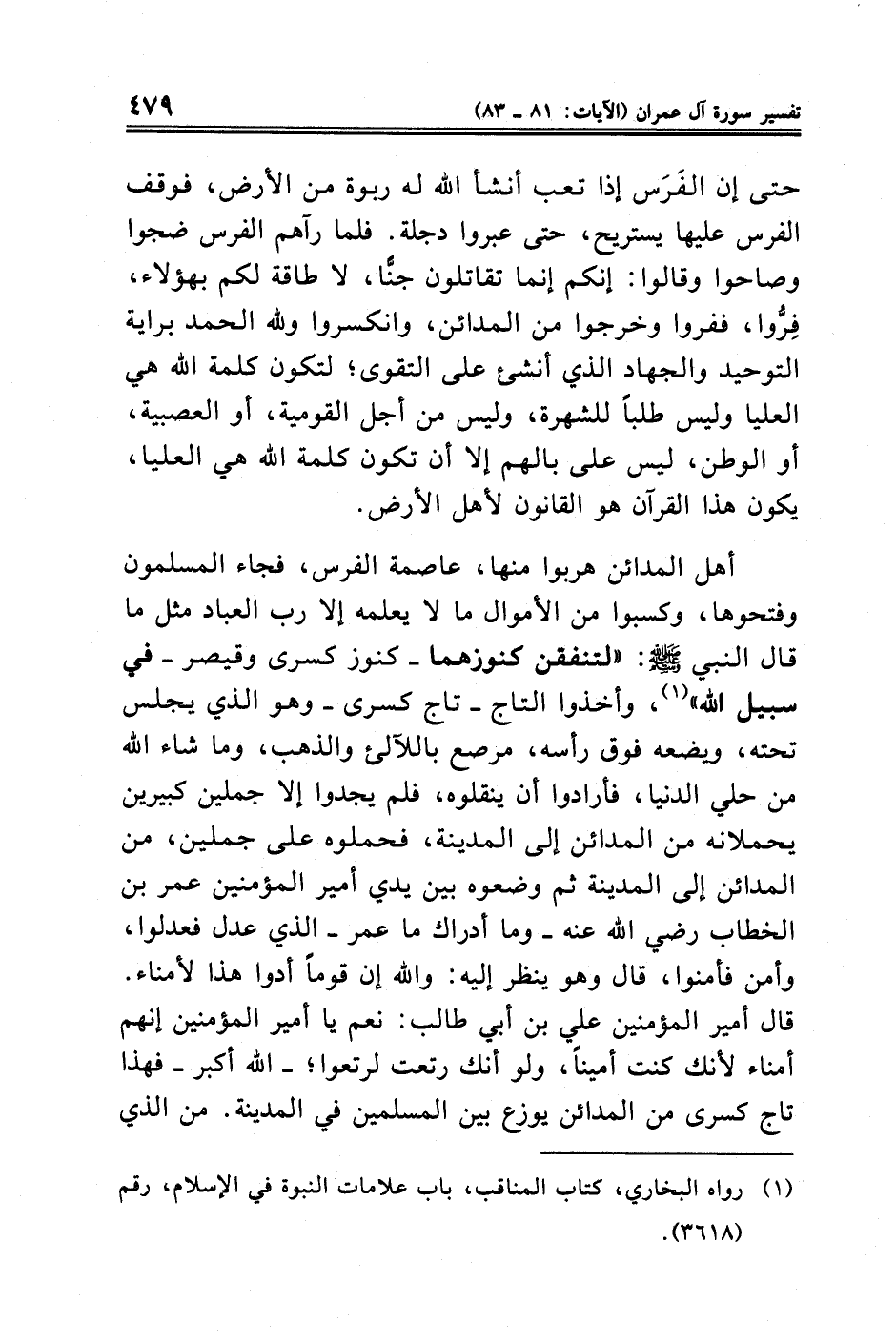 أهل المدائن هربوا منها، عاصمة الفرس، فجاء المسلمون وفتحوها، وكسبوا من الأموال ما لا يعلمه إلا رب العباد مثل ما قال النبي - صلى الله عليه وسلم -: "لتنفقن كنوزهما -كنوز كسرى وقيصر- في سبيل الله" (¬١)، وأخذوا التاج -تاج كسرى- وهو الذي يجلس تحته، ويضعه فوق رأسه، مرصع باللآلئ والذهب، وما شاء الله من حلي الدنيا، فأرادوا أن ينقلوه، فلم يجدوا إلا جملين كبيرين يحملانه من المدائن إلى المدينة، فحملوه على جملين، من المدائن إلى المدينة ثم وضعوه بين يدي أمير المؤمنين عمر بن الخطاب - رضي الله عنه -وما أدراك ما عمر- الذي عدل فعدلوا، وأمن فأمنوا، قال وهو ينظر إليه: والله إن قومًا أدوا هذا لأمناء. قال أمير المؤمنين علي بن أبي طالب: نعم يا أمير المؤمنين إنهم أمناء لأنك كنت أمينًا، ولو أنك رتعت لرتعوا؛ -الله أكبر- فهذا تاج كسرى من المدائن يوزع بين المسلمين في المدينة. من الذي