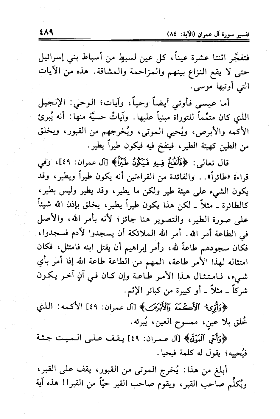 قال تعالى: {فَأَنْفُخُ فِيهِ فَيَكُونُ طَيْرًا} [آل عمران: ٤٩]، وفي قراءة "طائرًا" .. والفائدة من القراءتين أنه يكون طيرًا ويطير، وقد يكون الشيء على هيئة طير ولكن ما يطير، وقد يطير وليس بطير، كالطائرة -مثلًا- لكن هذا يكون طيرًا يطير، يخلق بإذن الله شيئًا على صورة الطير، والتصوير هنا جائز؛ لأنه بأمر الله، والأصل في الطاعة أمر الله. أمر الملائكة أن يسجدوا لآدم فسجدوا، فكان سجودهم طاعةً لله، وأمر إبراهيم أن يقتل ابنه فامتثل، فكان امتثاله لهذا الأمر طاعة، المهم من الطاعة طاعة الله إذا أمر بأي شيء، فامتثال هذا الأمر طاعة وإن كان في آنٍ آخر يكون شركًا -مثلًا- أو كبيرة من كبائر الإثم.