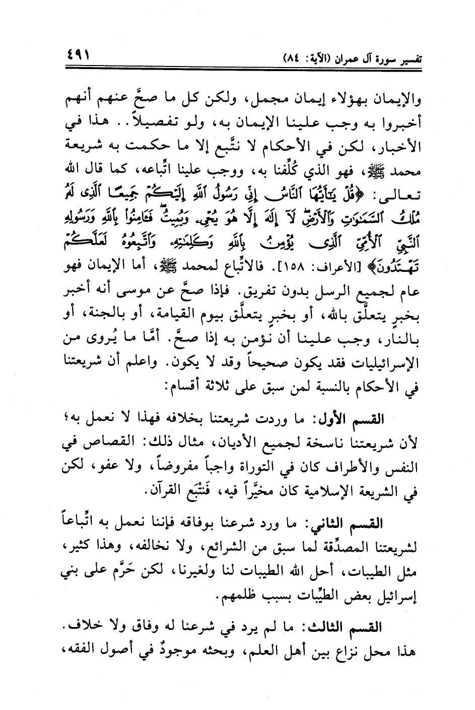 والإيمان بهؤلاء إيمان مجمل، ولكن كل ما صحَّ عنهم أنهم أخبروا به وجب علينا الإيمان به، ولو تفصيلًا .. هذا في الأخبار، لكن في الأحكام لا نتَّبع إلا ما حكمت به شريعة محمد - صلى الله عليه وسلم -، فهو الذي كُلِّفنا به، ووجب علينا اتِّباعه، كما قال الله تعالى: {قُلْ يَاأَيُّهَا النَّاسُ إِنِّي رَسُولُ اللَّهِ إِلَيْكُمْ جَمِيعًا الَّذِي لَهُ مُلْكُ السَّمَاوَاتِ وَالْأَرْضِ لَا إِلَهَ إِلَّا هُوَ يُحْيِي وَيُمِيتُ فَآمِنُوا بِاللَّهِ وَرَسُولِهِ النَّبِيِّ الْأُمِّيِّ الَّذِي يُؤْمِنُ بِاللَّهِ وَكَلِمَاتِهِ وَاتَّبِعُوهُ لَعَلَّكُمْ تَهْتَدُونَ} [الأعراف: ١٥٨] فالاتِّباع لمحمد - صلى الله عليه وسلم -، أما الإيمان فهو عام لجميِع الرسل بدون تفريق. فإذا صحَّ عن موسى أنه أخبر بخبرٍ يتعلّق بالله، أو بخبرٍ يتعلَّق بيوم القيامة، أو بالجنة، أو بالنار، وجب علينا أن نؤمن به إذا صحَّ. أمَّا ما يُروى من الإسرائيليات فقد يكون صحيحًا وقد لا يكون. واعلم أن شريعتنا في الأحكام بالنسبة لمن سبق على ثلاثة أقسام: