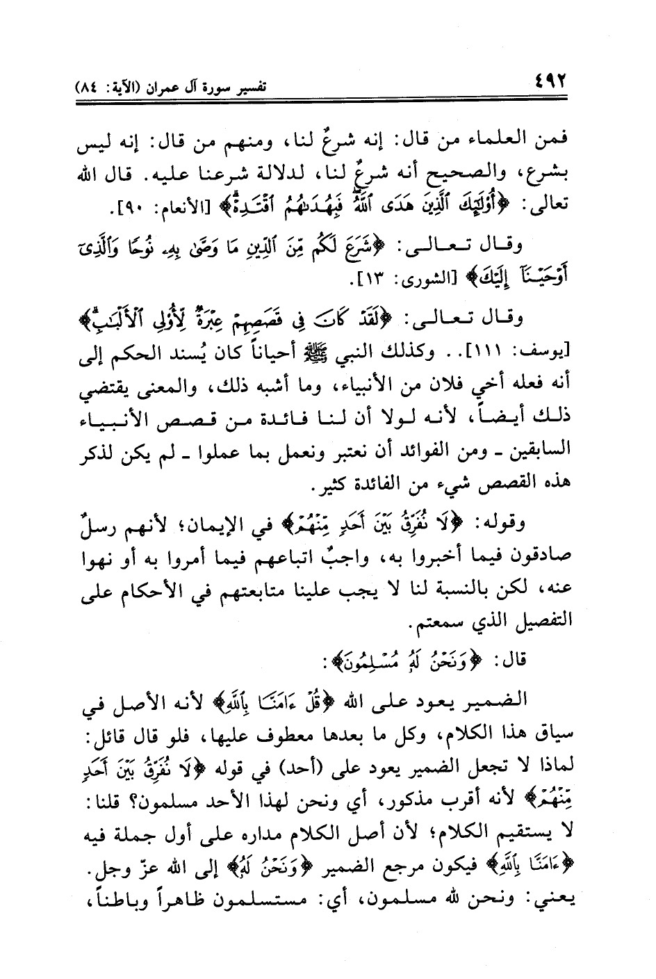وقال تعالى: {لَقَدْ كَانَ فِي قَصَصِهِمْ عِبْرَةٌ لِأُولِي الْأَلْبَابِ} [يوسف: ١١١] .. وكذلك النبي - صلى الله عليه وسلم - أحيانًا كان يُسند الحكم إلى أنه فعله أخي فلان من الأنبياء، وما أشبه ذلك، والمعنى يقتضي ذلك أيضًا، لأنه لولا أن لنا فائدة من قصص الأنبياء السابقين -ومن الفوائد أن نعتبر ونعمل بما عملوا- لم يكن لذكر هذه القصص شيء من الفائدة كثير.