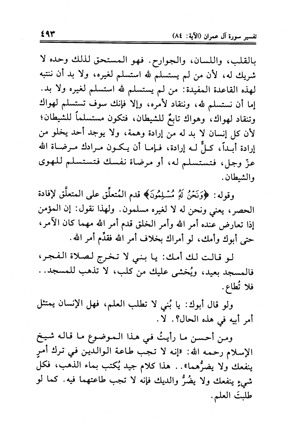 بالقلب، واللسان، والجوارح. فهو المستحق لذلك وحده لا شريك له، لأن من لم يستسلم لله استسلم لغيره، ولابد أن ننتبه لهذه القاعدة المفيدة: من لم يستسلم لله استسلم لغيره ولابد. إما أن نستسلم لله، وننقاد لأمره، وإلا فإنك سوف تستسلم لهواك وتنقاد لهواك، وهواك تابعٌ للشيطان، فتكون مستسلمًا للشيطان؛ لأن كل إنسان لابد له من إرادة وهمة، ولا يوجد أحد يخلو من إرادة أبدًا، كلٌّ له إرادة، فإما أن يكون مرادك مرضاة الله عزّ وجل، فتستسلم له أو مرضاة نفسك فتستسلم للهوى والشيطان.