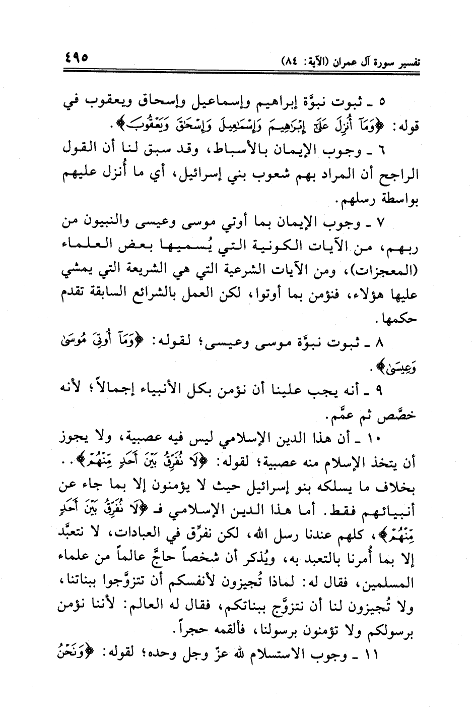 ١٠ - أن هذا الدين الإسلامي ليس فيه عصبية، ولا يجوز أن يتخذ الإسلام منه عصبية؛ لقوله: {لَا نُفَرِّقُ بَيْنَ أَحَدٍ مِنْهُمْ} .. بخلاف ما يسلكه بنو إسرائيل حيث لا يؤمنون إلا بما جاء عن أنبيائهم فقط. أما هذا الدين الإسلامي فـ {لَا نُفَرِّقُ بَيْنَ أَحَدٍ مِنْهُمْ}، كلهم عندنا رسل الله، لكن نفرِّق في العبادات، لا نتعبَّد إلا بما أُمرنا بالتعبد به، ويُذكر أن شخصًا حاجَّ عالمًا من علماء المسلمين، فقال له: لماذا تُجيزون لأنفسكم أن تتزوَّجوا ببناتنا، ولا تُجيزون لنا أن نتزوَّج ببناتكم، فقال له العالم: لأننا نؤمن برسولكم ولا تؤمنون برسولنا، فألقمه حجرًا.