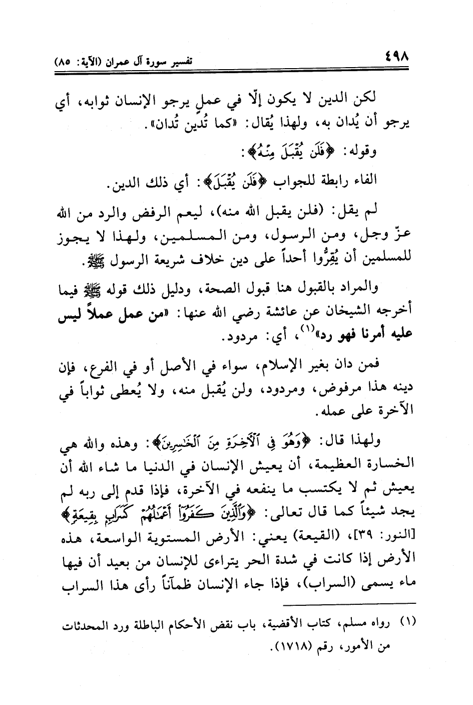 ولهذا قال: {وَهُوَ فِي الْآخِرَةِ مِنَ الْخَاسِرِينَ}: وهذه والله هي الخسارة العظيمة، أن يعيش الإنسان في الدنيا ما شاء الله أن يعيش ثم لا يكتسب ما ينفعه في الآخرة، فإذا قدم إلى ربه لم يجد شيئًا كما قال تعالى: {وَالَّذِينَ كَفَرُوا أَعْمَالُهُمْ كَسَرَابٍ بِقِيعَةٍ} [النور: ٣٩]، (القيعة) يعني: الأرض المستوية الواسعة، هذه الأرض إذا كانت في شدة الحر يتراءى للإنسان من بعيد أن فيها ماء يسمى (السراب)، فإذا جاء الإنسان ظمآنًا رأى هذا السراب