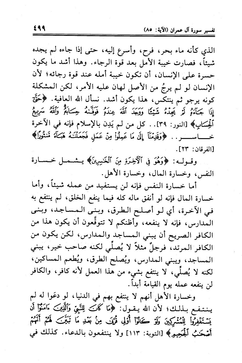 الذي كأنه ماء بحر، فرح، وأسرع إليه، حتى إذا جاءه لم يجده شيئًا، فصارت خيبة الأمل بعد قوة الرجاء. وهذا أشد ما يكون حسرة على الإنسان، أن تكون خيبة أمله عند قوة رجائه؛ لأن الإنسان لو لم يرجُ من الأصل لهان عليه الأمر، لكن المشكلة كونه يرجو ثم ينتكس، هذا يكون أشد. نسأل الله العافية. {حَتَّى إِذَا جَاءَهُ لَمْ يَجِدْهُ شَيْئًا وَوَجَدَ اللَّهَ عِنْدَهُ فَوَفَّاهُ حِسَابَهُ وَاللَّهُ سَرِيعُ الْحِسَابِ} [النور: ٣٩] .. كل من لم يَدِن بالإسلام فإنه في الآخرة خاسر .. {وَقَدِمْنَا إِلَى مَا عَمِلُوا مِنْ عَمَلٍ فَجَعَلْنَاهُ هَبَاءً مَنْثُورًا} [الفرقان: ٢٣].