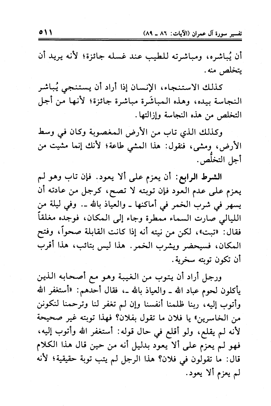 الشرط الرابع: أن يعزم على ألا يعود. فإن تاب وهو لم يعزم على عدم العود فإن توبته لا تصح، كرجل من عادته أن يسهر في شرب الخمر في أماكنها -والعياذ بالله-. وفي ليلة من الليالي صارت السماء ممطرة وجاء إلى المكان، فوجده مغلقًا فقال: "تبت"، لكن من نيته أنه إذا كانت القابلة صحوًا، وفتح المكان، فسيحضر ويشرب الخمر. هذا ليس بتائب، هذا أقرب أن تكون توبته سخرية.