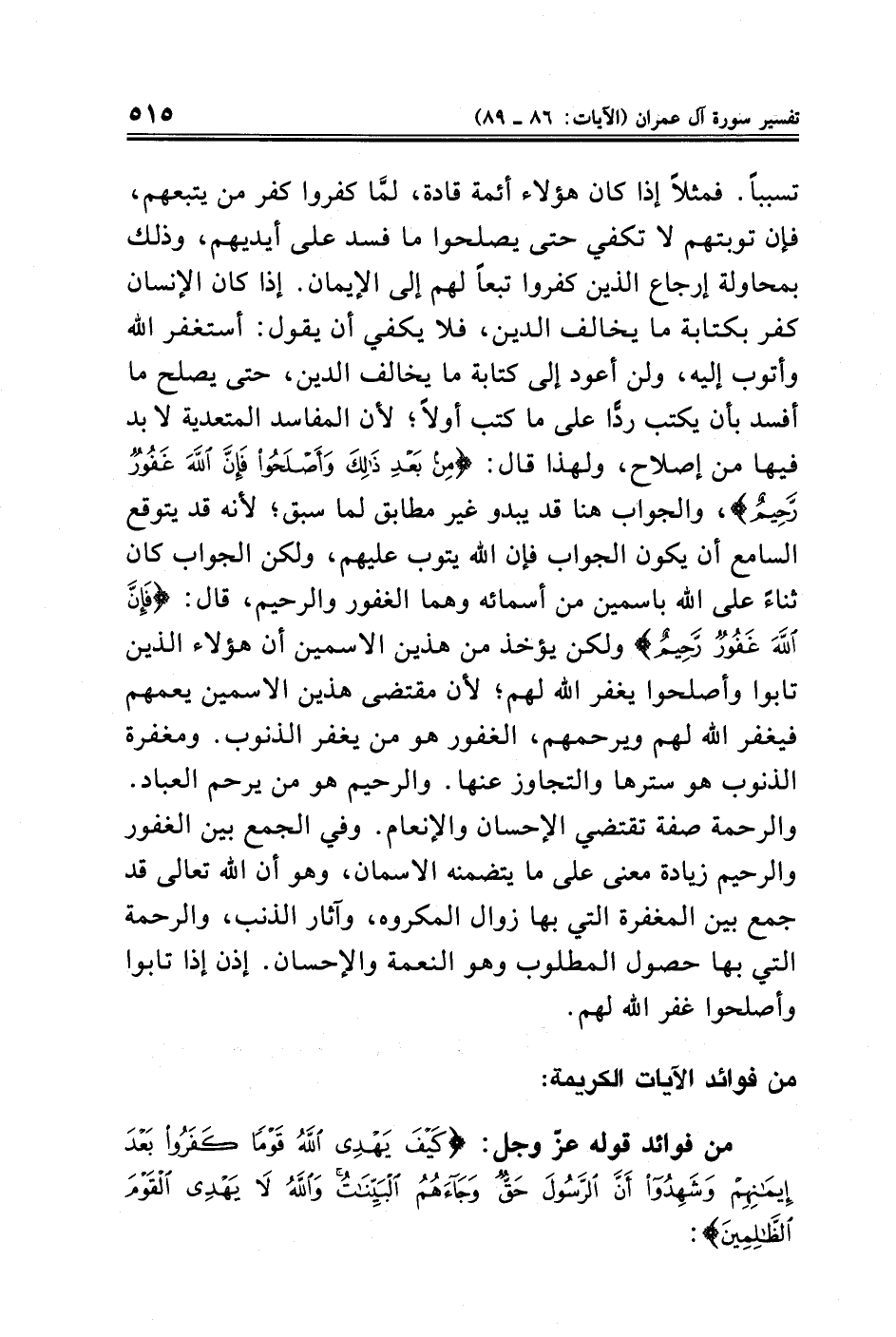 تسببًا. فمثلًا إذا كان هؤلاء أئمة قادة، لمَّا كفروا كفر من يتبعهم، فإن توبتهم لا تكفي حتى يصلحوا ما فسد على أيديهم، وذلك بمحاولة إرجاع الذين كفروا تبعًا لهم إلى الإيمان. إذا كان الإنسان كفر بكتابة ما يخالف الدين، فلا يكفي أن يقول: أستغفر الله وأتوب إليه، ولن أعود إلى كتابة ما يخالف الدين، حتى يصلح ما أفسد بأن يكتب ردًّا على ما كتب أولًا؛ لأن المفاسد المتعدية لابد فيها من إصلاح، ولهذا قال: {مِنْ بَعْدِ ذَلِكَ وَأَصْلَحُوا فَإِنَّ اللَّهَ غَفُورٌ رَحِيمٌ} والجواب هنا قد يبدو غير مطابق لما سبق؛ لأنه قد يتوقع السامع أن يكون الجواب فإن الله يتوب عليهم، ولكن الجواب كان ثناءً على الله باسمين من أسمائه وهما الغفور والرحيم، قال: {فَإِنَّ اللَّهَ غَفُورٌ رَحِيمٌ} ولكن يؤخذ من هذين الاسمين أن هؤلاء الذين تابوا وأصلحوا يغفر الله لهم؛ لأن مقتضى هذين الاسمين يعمهم فيغفر الله لهم ويرحمهم، الغفور هو من يغفر الذنوب. ومغفرة الذنوب هو سترها والتجاوز عنها. والرحيم هو من يرحم العباد. والرحمة صفة تقتضي الإحسان والإنعام. وفي الجمع بين الغفور والرحيم زيادة معنى على ما يتضمنه الاسمان، وهو أن الله تعالى قد جمع بين المغفرة التي بها زوال المكروه، وآثار الذنب، والرحمة التي بها حصول المطلوب وهو النعمة والإحسان. إذن إذا تابوا وأصلحوا غفر الله لهم.