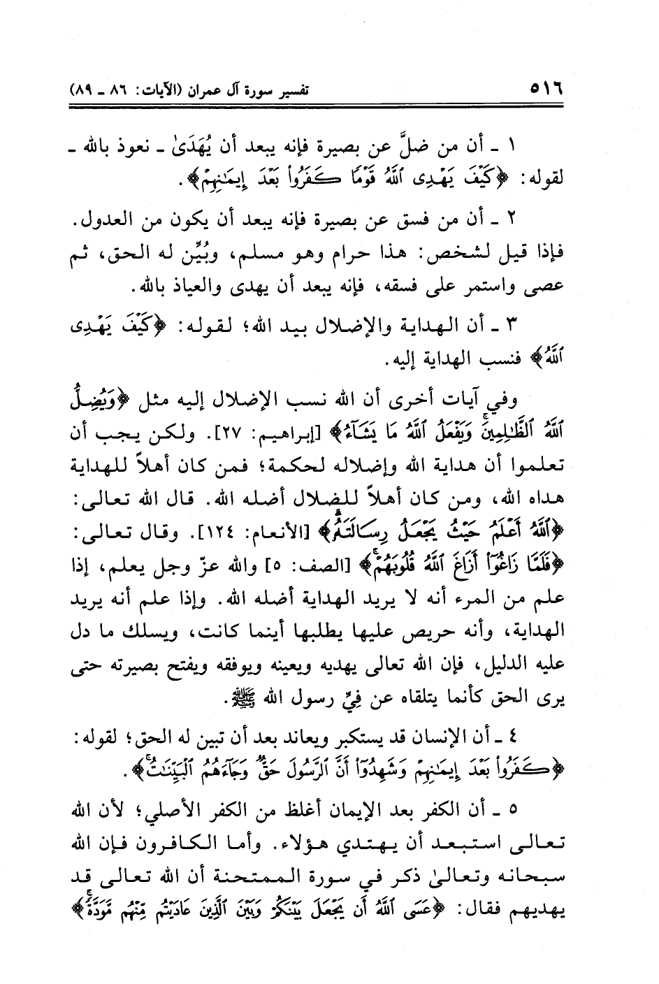وفي آيات أخرى أن الله نسب الإضلال إليه مثل {وَيُضِلُّ اللَّهُ الظَّالِمِينَ وَيَفْعَلُ اللَّهُ مَا يَشَاءُ} [إبراهيم: ٢٧]. ولكن يجب أن تعلموا أن هداية الله وإضلاله لحكمة؛ فمن كان أهلًا للهداية هداه الله، ومن كان أهلًا للضلال أضله الله. قال الله تعالى: {اللَّهُ أَعْلَمُ حَيْثُ يَجْعَلُ رِسَالَتَهُ} [الأنعام: ١٢٤]. وقال تعالى: {فَلَمَّا زَاغُوا أَزَاغَ اللَّهُ قُلُوبَهُمْ} [الصف: ٥] والله عزّ وجل يعلم، إذا علم من المرء أنه لا يريد الهداية أضله الله. وإذا علم أنه يريد الهداية، وأنه حريص عليها يطلبها أينما كانت، ويسلك ما دل عليه الدليل، فإن الله تعالى يهديه ويعينه ويوفقه ويفتح بصيرته حتى يرى الحق كأنما يتلقاه عن فِيِّ رسول الله - صلى الله عليه وسلم -.