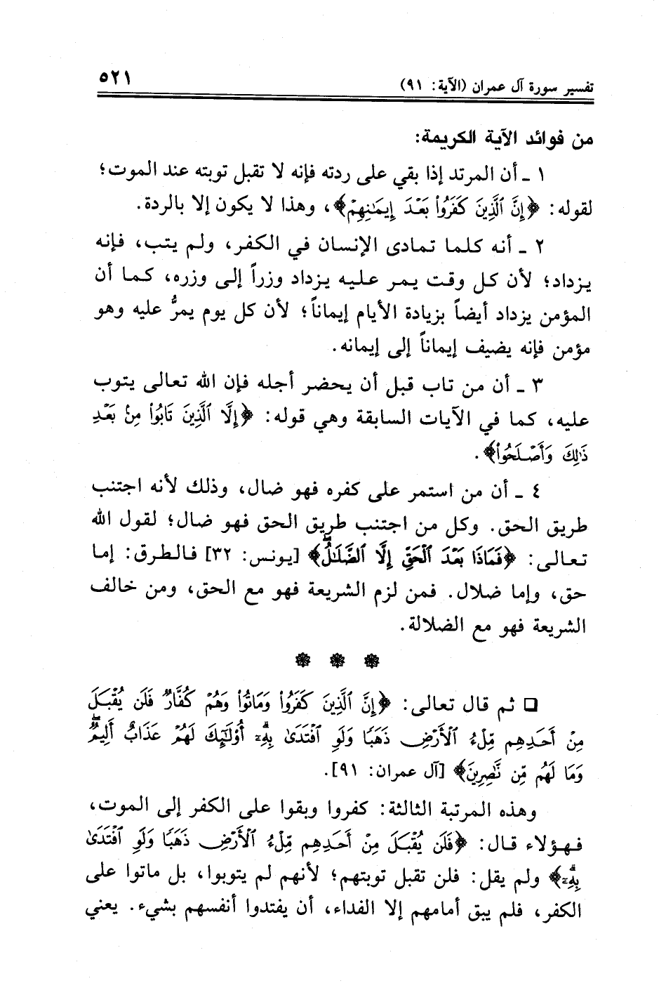 • ثم قال تعالى: {إِنَّ الَّذِينَ كَفَرُوا وَمَاتُوا وَهُمْ كُفَّارٌ فَلَنْ يُقْبَلَ مِنْ أَحَدِهِمْ مِلْءُ الْأَرْضِ ذَهَبًا وَلَوِ افْتَدَى بِهِ أُولَئِكَ لَهُمْ عَذَابٌ أَلِيمٌ وَمَا لَهُمْ مِنْ نَاصِرِينَ} [آل عمران: ٩١].