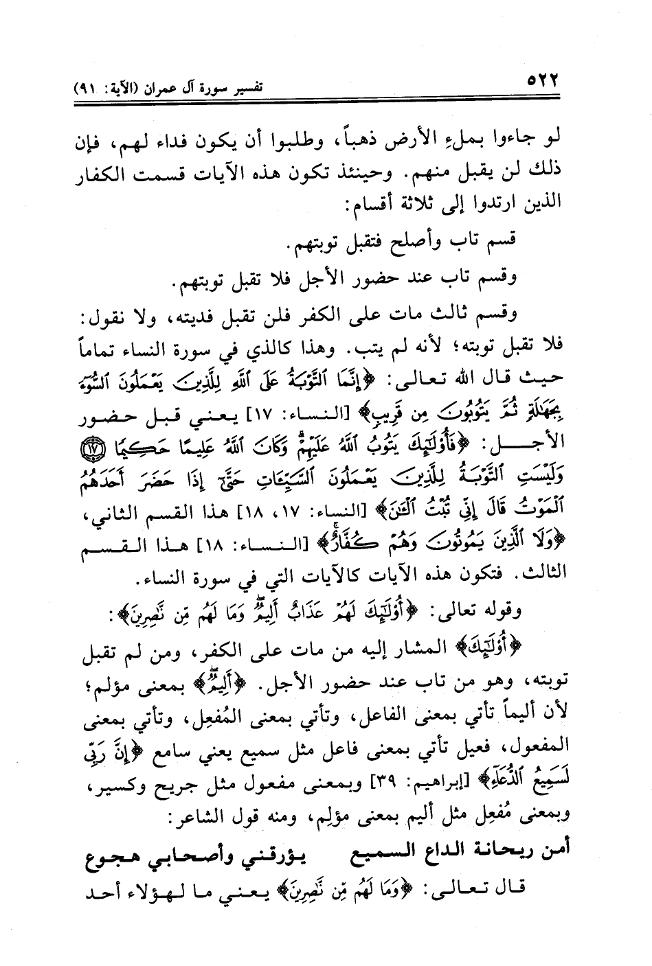 وقسم ثالث مات على الكفر فلن تقبل فديته، ولا نقول: فلا تقبل توبته؛ لأنه لم يتب. وهذا كالذي في سورة النساء تمامًا حيث قال الله تعالى: {إِنَّمَا التَّوْبَةُ عَلَى اللَّهِ لِلَّذِينَ يَعْمَلُونَ السُّوءَ بِجَهَالَةٍ ثُمَّ يَتُوبُونَ مِنْ قَرِيبٍ} [النساء: ١٧] يعني قبل حضور الأجل: {فَأُولَئِكَ يَتُوبُ اللَّهُ عَلَيْهِمْ وَكَانَ اللَّهُ عَلِيمًا حَكِيمًا (١٧) وَلَيْسَتِ التَّوْبَةُ لِلَّذِينَ يَعْمَلُونَ السَّيِّئَاتِ حَتَّى إِذَا حَضَرَ أَحَدَهُمُ الْمَوْتُ قَالَ إِنِّي تُبْتُ الْآنَ} [النساء: ١٧، ١٨] هذا القسم الثاني، {وَلَا الَّذِينَ يَمُوتُونَ وَهُمْ كُفَّارٌ} [النساء: ١٨] هذا القسم الثالث. فتكون هذه الآيات كالآيات التي في سورة النساء.