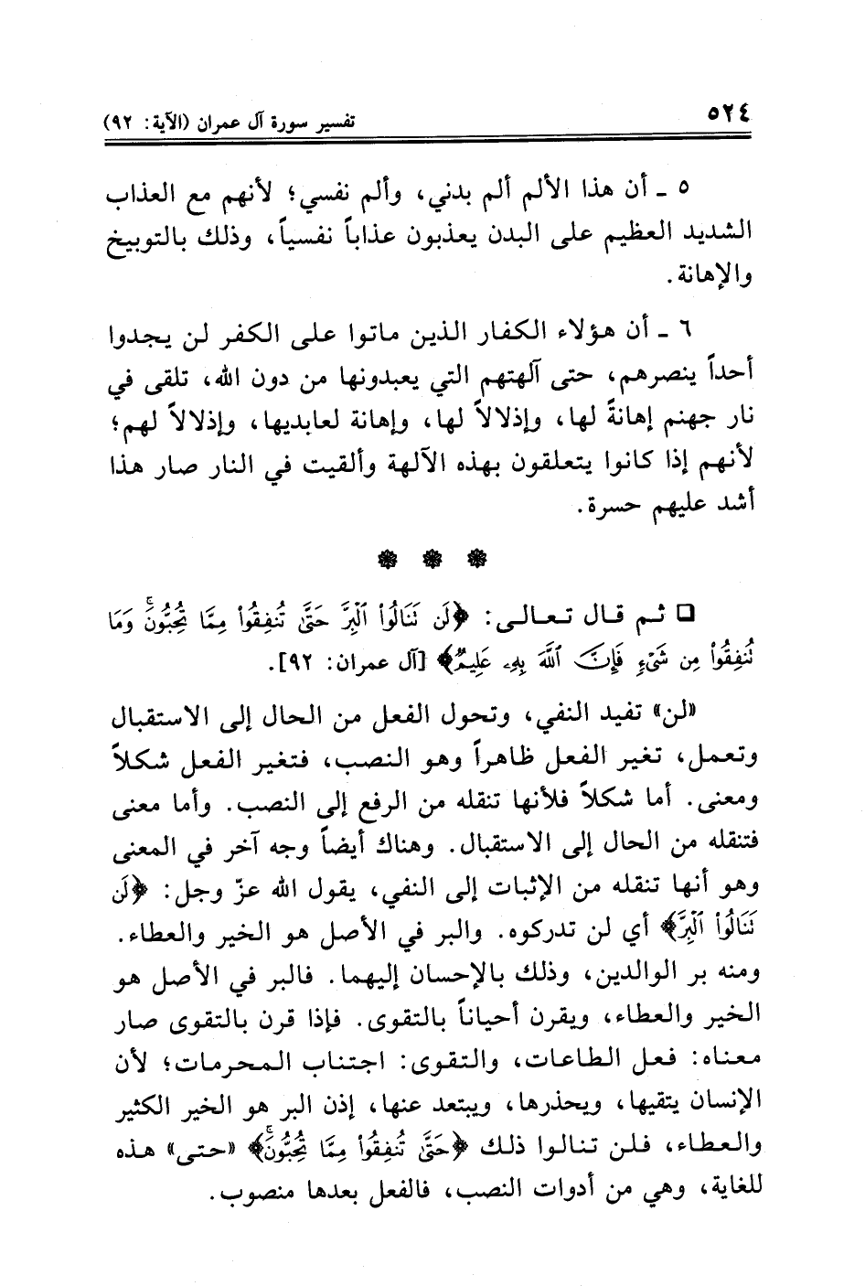 "لن" تفيد النفي، وتحول الفعل من الحال إلى الاستقبال وتعمل، تغير الفعل ظاهرًا وهو النصب، فتغير الفعل شكلًا ومعنى. أما شكلًا فلأنها تنقله من الرفع إلى النصب. وأما معنى فتنقله من الحال إلى الاستقبال. وهناك أيضًا وجه آخر في المعنى وهو أنها تنقله من الإثبات إلى النفي، يقول الله عزّ وجل: {لَنْ تَنَالُوا الْبِرَّ} أي لن تدركوه. والبر في الأصل هو الخير والعطاء. ومنه بر الوالدين، وذلك بالإحسان إليهما. فالبر في الأصل هو الخير والعطاء، ويقرن أحيانًا بالتقوى. فإذا قرن بالتقوى صار معناه: فعل الطاعات، والتقوى: اجتناب المحرمات؛ لأن الإنسان يتقيها، ويحذرها، ويبتعد عنها، إذن البر هو الخير الكثير والعطاء، فلن تنالوا ذلك {حَتَّى تُنْفِقُوا مِمَّا تُحِبُّونَ} "حتى" هذه للغاية، وهي من أدوات النصب، فالفعل بعدها منصوب.