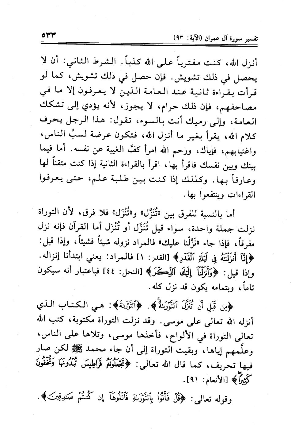 أما بالنسبة للفرق بين "تُنَزَّل" و"تُنْزَل" فلا فرق، لأن التوراة نزلت جملة واحدة، سواء قيل تُنَزَّل أو تُنْزَل أما القرآن فإنه نزل مفرقًا، فإذا جاء "نَزَّلْنا عليك" فالمراد نزوله شيئًا فشيئًا، وإذا قيل: {إِنَّا أَنْزَلْنَاهُ فِي لَيْلَةِ الْقَدْرِ} [القدر: ١] فالمراد: يعني ابتدأنا إنزاله. وإذا قيل: {وَأَنْزَلْنَا إِلَيْكَ الذِّكْرَ} [النحل: ٤٤] فباعتبار أنه سيكون تامًا، وبتمامه يكون قد نزل كله.