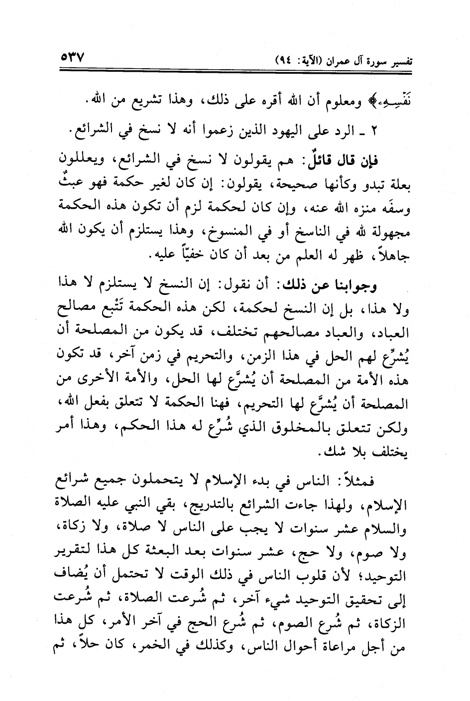 وجوابنا عن ذلك: أن نقول: إن النسخ لا يستلزم لا هذا ولا هذا، بل إن النسخ لحكمة، لكن هذه الحكمة تَتْبع مصالح العباد، والعباد مصالحهم تختلف، قد يكون من المصلحة أن يُشرّع لهم الحل في هذا الزمن، والتحريم في زمن آخر، قد تكون هذه الأمة من المصلحة أنْ يُشرَّع لها الحل، والأمة الأخرى من المصلحة أن يُشرَّع لها التحريم، فهنا الحكمة لا تتعلق بفعل الله، ولكن تتعلق بالمخلوق الذي شُرِّع له هذا الحكم، وهذا أمر يختلف بلا شك.
