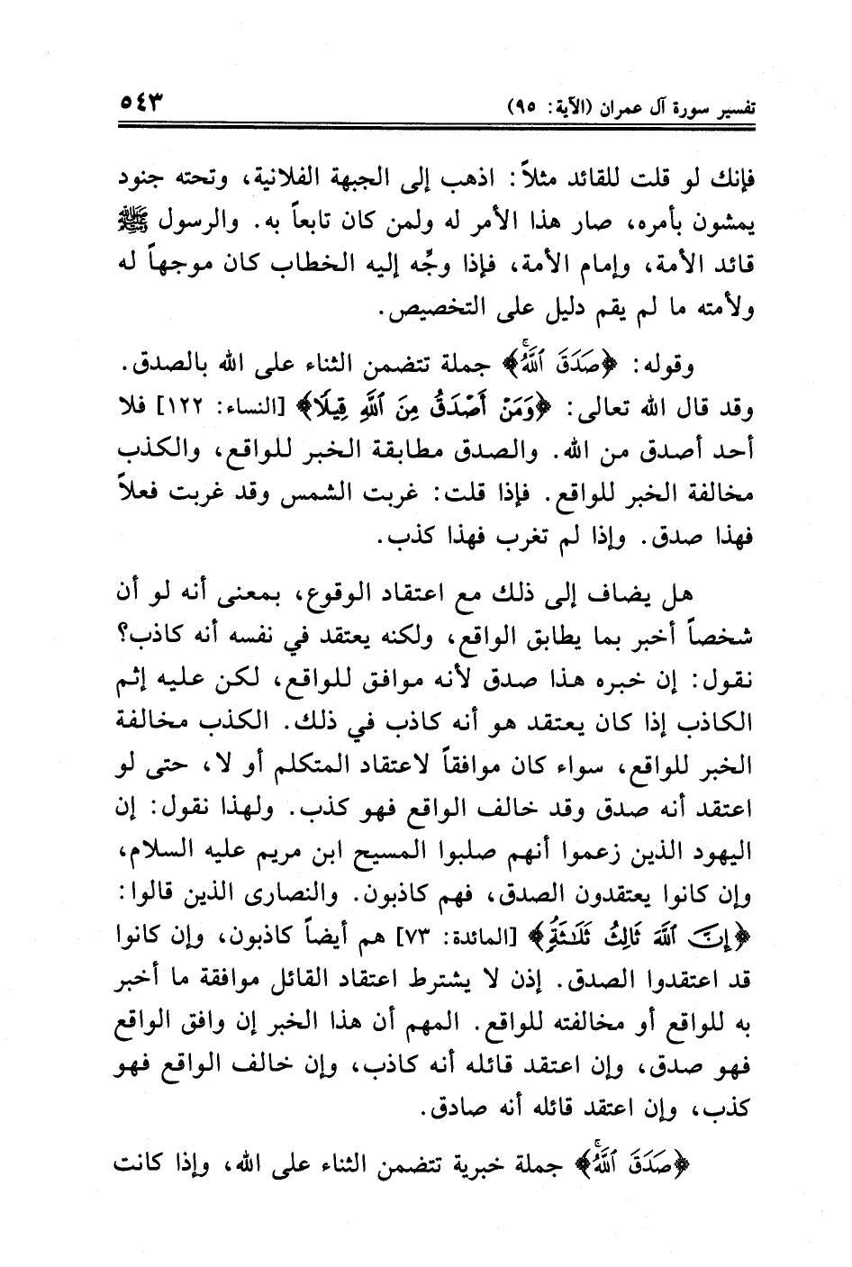 هل يضاف إلى ذلك مع اعتقاد الوقوع، بمعنى أنه لو أن شخصًا أخبر بما يطابق الواقع، ولكنه يعتقد في نفسه أنه كاذب؟ نقول: إن خبره هذا صدق لأنه موافق للواقع، لكن عليه إثم الكاذب إذا كان يعتقد هو أنه كاذب في ذلك. الكذب مخالفة الخبر للواقع، سواء كان موافقًا لاعتقاد المتكلم أو لا، حتى لو اعتقد أنه صدق وقد خالف الواقع فهو كذب. ولهذا نقول: إن اليهود الذين زعموا أنهم صلبوا المسيح ابن مريم عليه السلام، وإن كانوا يعتقدون الصدق، فهم كاذبون. والنصارى الذين قالوا: {إِنَّ اللَّهَ ثَالِثُ ثَلَاثَةٍ} [المائدة: ٧٣] هم أيضًا كاذبون، وإن كانوا قد اعتقدوا الصدق. إذن لا يشترط اعتقاد القائل موافقة ما أخبر به للواقع أو مخالفته للواقع. المهم أن هذا الخبر إن وافق الواقع فهو صدق، وإن اعتقد قائله أنه كاذب، وإن خالف الواقع فهو كذب، وإن اعتقد قائله أنه صادق.