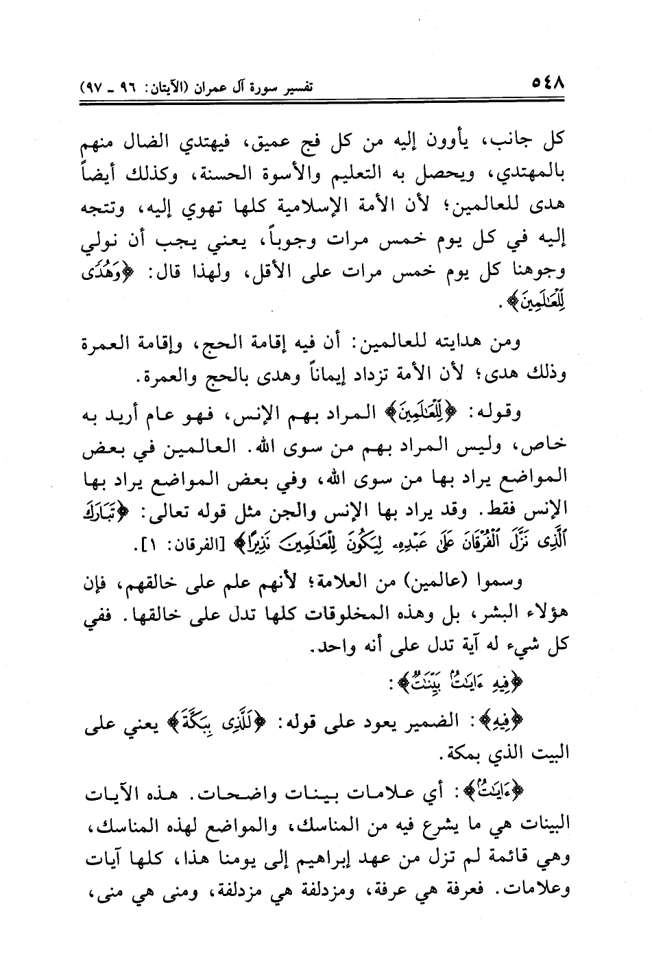ومن هدايته للعالمين: أن فيه إقامة الحج، وإقامة العمرة وذلك هدى؛ لأن الأمة تزداد إيمانًا وهدى بالحج والعمرة.