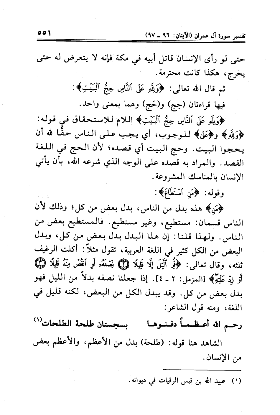 {مَنِ} هذه بدل من الناس، بدل بعض من كل؛ وذلك لأن الناس قسمان: مستطيع، وغير مستطيع. فالمستطيع بعض من الناس. ولهذا قلنا: إن هذا البدل بدل بعض من كل، وبدل البعض من الكل كثير في اللغة العربية، تقول مثلًا: أكلت الرغيف ثلثه، وقال تعالى: {قُمِ اللَّيْلَ إِلَّا قَلِيلًا (٢) نِصْفَهُ أَوِ انْقُصْ مِنْهُ قَلِيلًا (٣) أَوْ زِدْ عَلَيْهِ} [المزمل: ٢ - ٤]. إذا جعلنا نصفه بدلًا من الليل فهو بدل بعض من كل. وقد يبدل الكل من البعض، لكنه قليل في اللغة، ومنه قول الشاعر:
