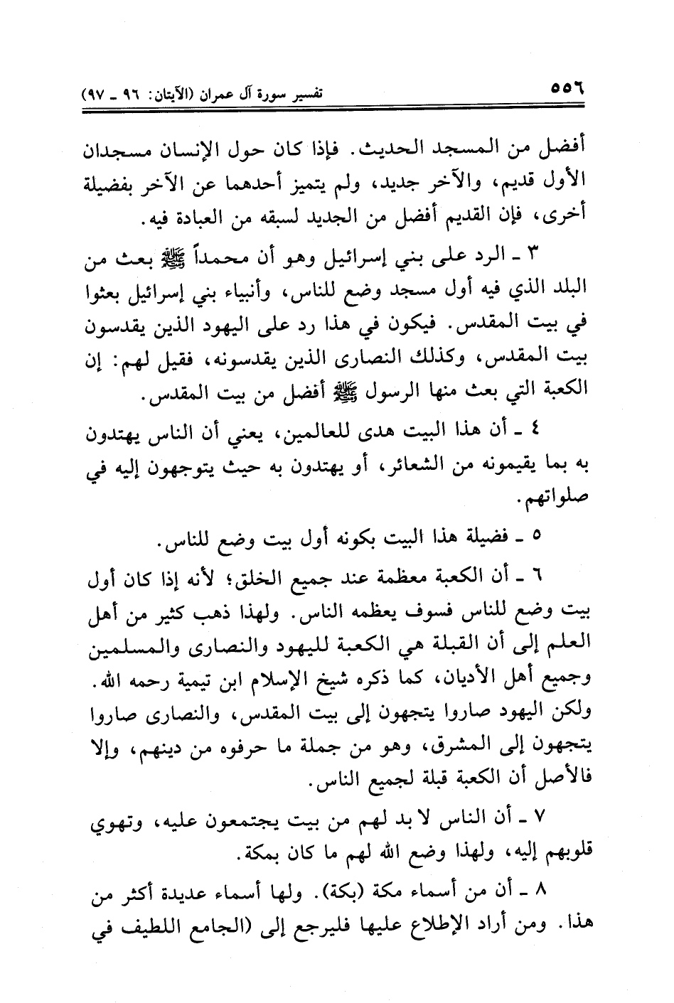 ٣ - الرد على بني إسرائيل وهو أن محمدًا - صلى الله عليه وسلم - بعث من البلد الذي فيه أول مسجد وضع للناس، وأنبياء بني إسرائيل بعثوا في بيت المقدس. فيكون في هذا رد على اليهود الذين يقدسون بيت المقدس، وكذلك النصارى الذين يقدسونه، فقيل لهم: إن الكعبة التي بعث منها الرسول - صلى الله عليه وسلم - أفضل من بيت المقدس.