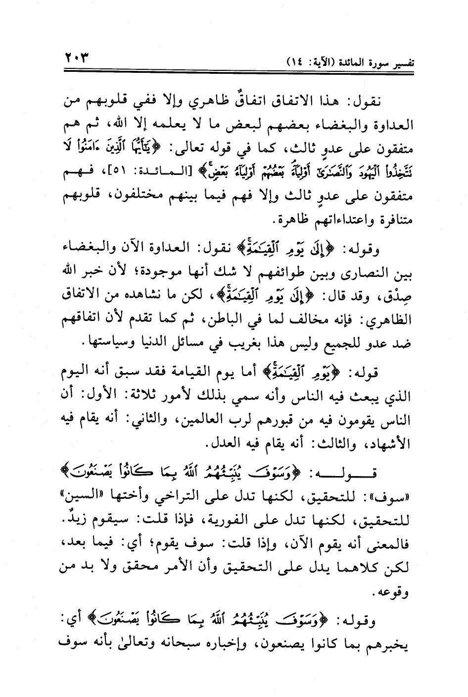 وقوله: {إِلَى يَوْمِ الْقِيَامَةِ} نقول: العداوة الآن والبغضاء بين النصارى وبين طوائفهم لا شك أنها موجودة؛ لأن خبر الله صِدْق، وقد قال: {إِلَى يَوْمِ الْقِيَامَةِ}، لكن ما نشاهده من الاتفاق الظاهري: فإنه مخالف لما في الباطن، ثم كما تقدم لأن اتفاقهم ضد عدو للجميع وليس هذا بغريب في مسائل الدنيا وسياستها.