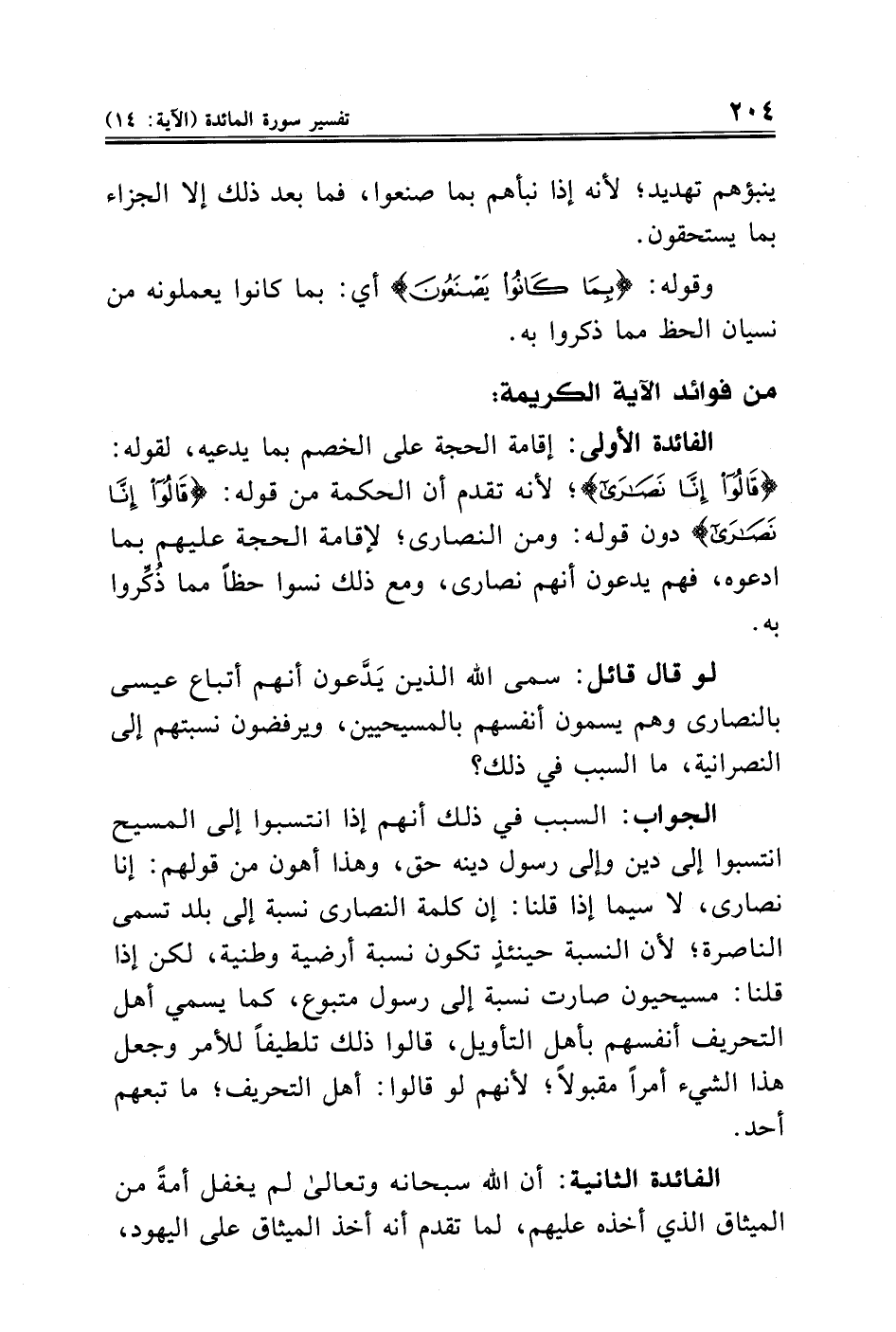 الفائدة الأولى: إقامة الحجة على الخصم بما يدعيه، لقوله: {قَالُوا إِنَّا نَصَارَى}؛ لأنه تقدم أن الحكمة من قوله: {قَالُوا إِنَّا نَصَارَى} دون قوله: ومن النصارى؛ لإقامة الحجة عليهم بما ادعوه، فهم يدعون أنهم نصارى، ومع ذلك نسوا حظًّا مما ذُكِّروا به.