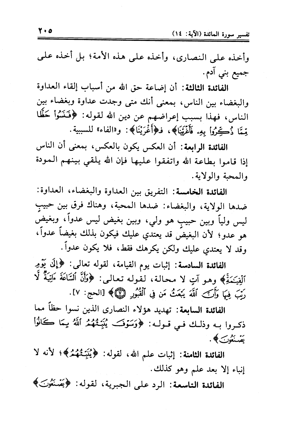الفائدة الثالثة: أن إضاعة حق الله من أسباب إلقاء العداوة والبغضاء بين الناس، بمعنى أنك متى وجدت عداوة وبغضاء بين الناس، فهذا بسبب إعراضهم عن دين الله لقوله: {فَنَسُوا حَظًّا مِمَّا ذُكِّرُوا بِهِ فَأَغْرَيْنَا}، فـ {أَغْرَيْنَا}: و"الفاء" للسببية.