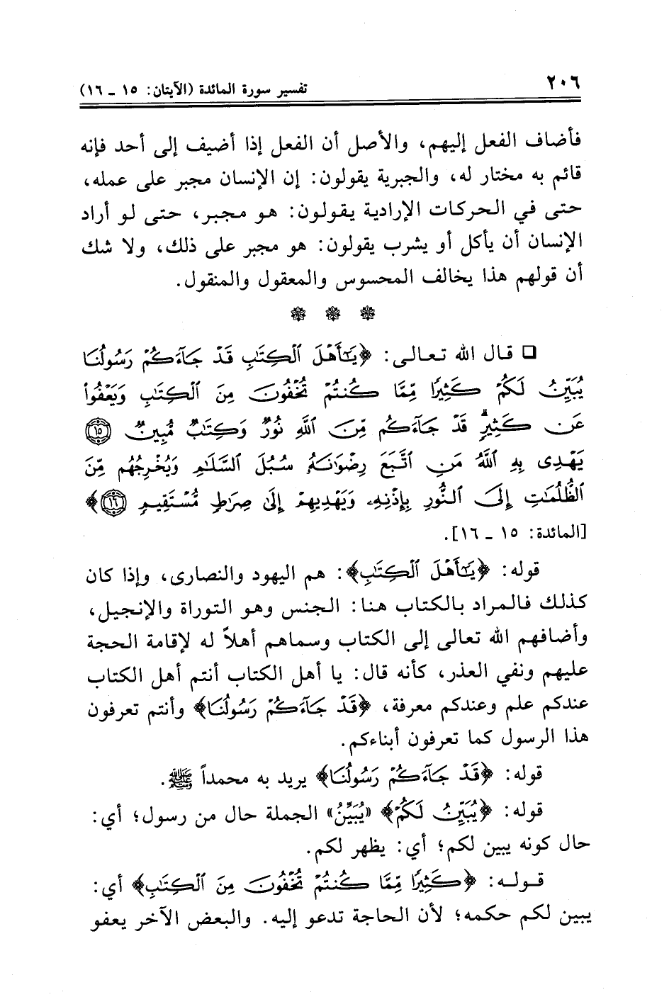 ° قال الله تعالى: {يَاأَهْلَ الْكِتَابِ قَدْ جَاءَكُمْ رَسُولُنَا يُبَيِّنُ لَكُمْ كَثِيرًا مِمَّا كُنْتُمْ تُخْفُونَ مِنَ الْكِتَابِ وَيَعْفُو عَنْ كَثِيرٍ قَدْ جَاءَكُمْ مِنَ اللَّهِ نُورٌ وَكِتَابٌ مُبِينٌ (١٥) يَهْدِي بِهِ اللَّهُ مَنِ اتَّبَعَ رِضْوَانَهُ سُبُلَ السَّلَامِ وَيُخْرِجُهُمْ مِنَ الظُّلُمَاتِ إِلَى النُّورِ بِإِذْنِهِ وَيَهْدِيهِمْ إِلَى صِرَاطٍ مُسْتَقِيمٍ (١٦)} [المائدة: ١٥، ١٦].
