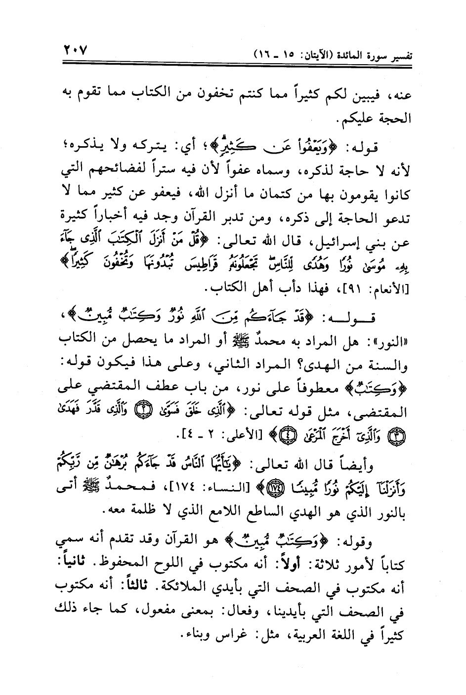 قوله: {قَدْ جَاءَكُمْ مِنَ اللَّهِ نُورٌ وَكِتَابٌ مُبِينٌ}، "النور": هل المراد به محمدٌ - صلى الله عليه وسلم - المراد ما يحصل من الكتاب والسنة من الهدى؟ المراد الثاني، وعلى هذا فيكون قوله: {وَكِتَابٌ} معطوفًا على نور، من باب عطف المقتضي على المقتضى، مثل قوله تعالى: {الَّذِي خَلَقَ فَسَوَّى (٢) وَالَّذِي قَدَّرَ فَهَدَى (٣) وَالَّذِي أَخْرَجَ الْمَرْعَى (٤)} [الأعلى: ٢ - ٤].