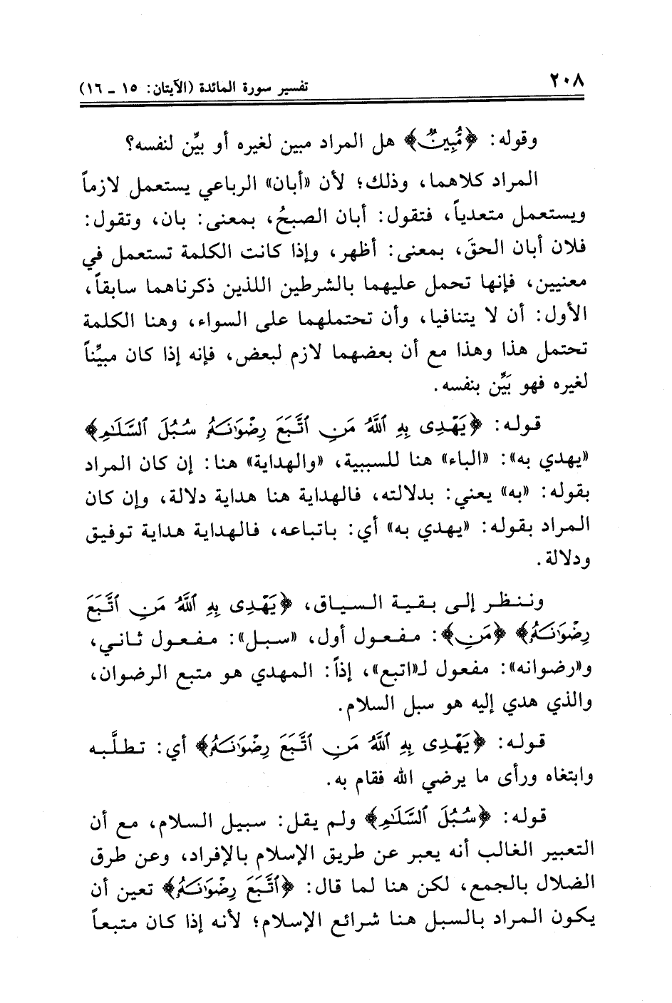 قوله: {يَهْدِي بِهِ اللَّهُ مَنِ اتَّبَعَ رِضْوَانَهُ سُبُلَ السَّلَامِ} "يهدي به": "الباء" هنا للسببية، "والهداية" هنا: إن كان المراد بقوله: "به" يعني: بدلالته، فالهداية هنا هداية دلالة، وإن كان المراد بقوله: "يهدي به" أي: باتباعه، فالهداية هداية توفيق ودلالة.