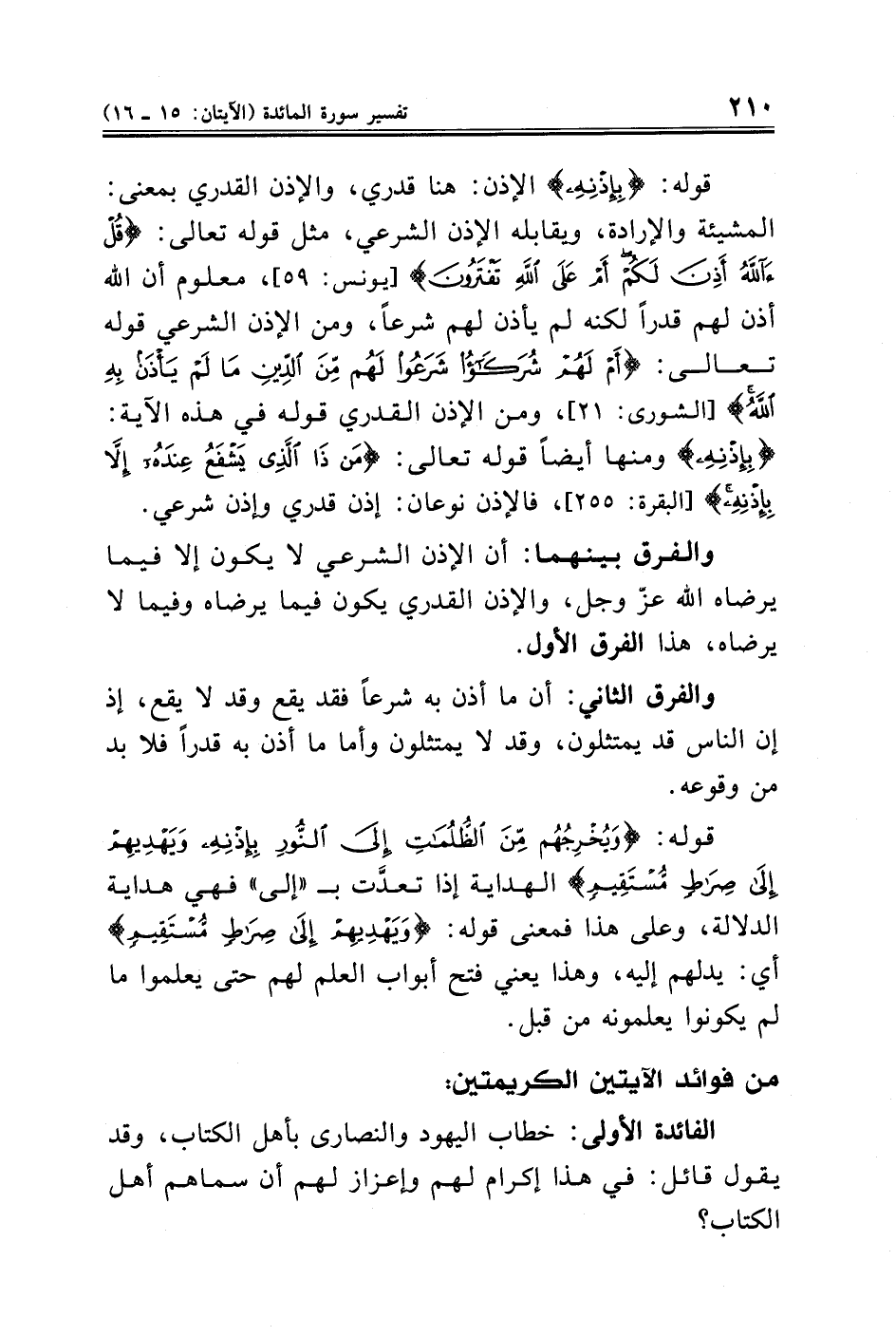 قوله: {وَيُخْرِجُهُمْ مِنَ الظُّلُمَاتِ إِلَى النُّورِ بِإِذْنِهِ وَيَهْدِيهِمْ إِلَى صِرَاطٍ مُسْتَقِيمٍ} الهداية إذا تعدَّت بـ "إلى" فهي هداية الدلالة، وعلى هذا فمعنى قوله: {وَيَهْدِيهِمْ إِلَى صِرَاطٍ مُسْتَقِيمٍ} أي: يدلهم إليه، وهذا يعني فتح أبواب العلم لهم حتى يعلموا ما لم يكونوا يعلمونه من قبل.