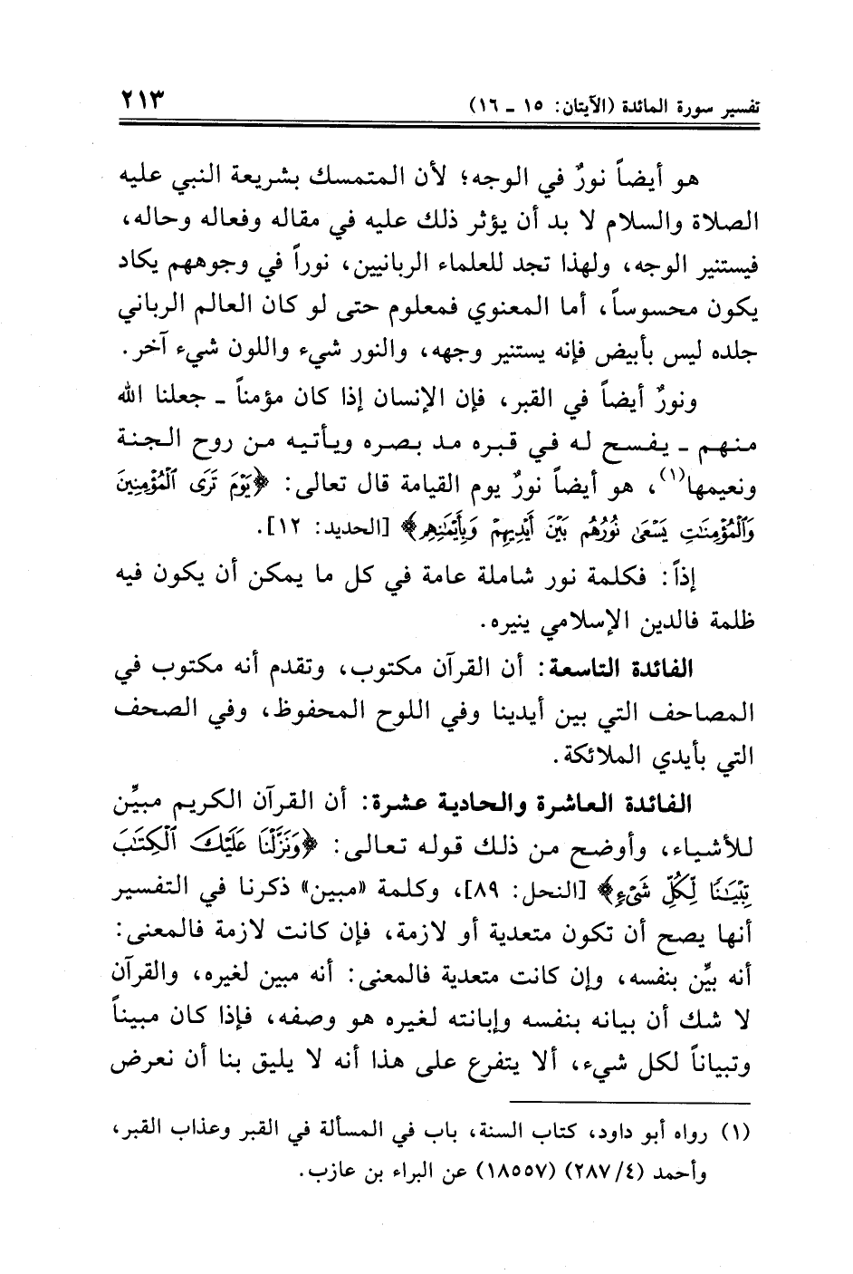 ونورٌ أيضًا في القبر، فإن الإنسان إذا كان مؤمنًا -جعلنا الله منهم- يفسح له في قبره مد بصره ويأتيه من روح الجنة ونعيمها (¬١)، هو أيضًا نورٌ يوم القيامة قال تعالى: {يَوْمَ تَرَى الْمُؤْمِنِينَ وَالْمُؤْمِنَاتِ يَسْعَى نُورُهُمْ بَيْنَ أَيْدِيهِمْ وَبِأَيْمَانِهِمْ} [الحديد: ١٢].