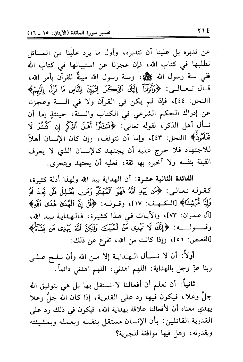 ثانيًا: أن نعلم أن أفعالنا لا نستقل بها بل هي بتوفيق الله جلَّ وعلا، فيكون فيها رد على القدرية، إذا كان الله جلَّ وعلا يهدي معناه أن لأفعالنا علاقة بهداية الله، فيكون في ذلك رد على القدرية القائلين: بأن الإنسان مستقل بنفسه وبعمله وبمشيئته وبقدرته، وهل فيها موافقة للجبرية؟
