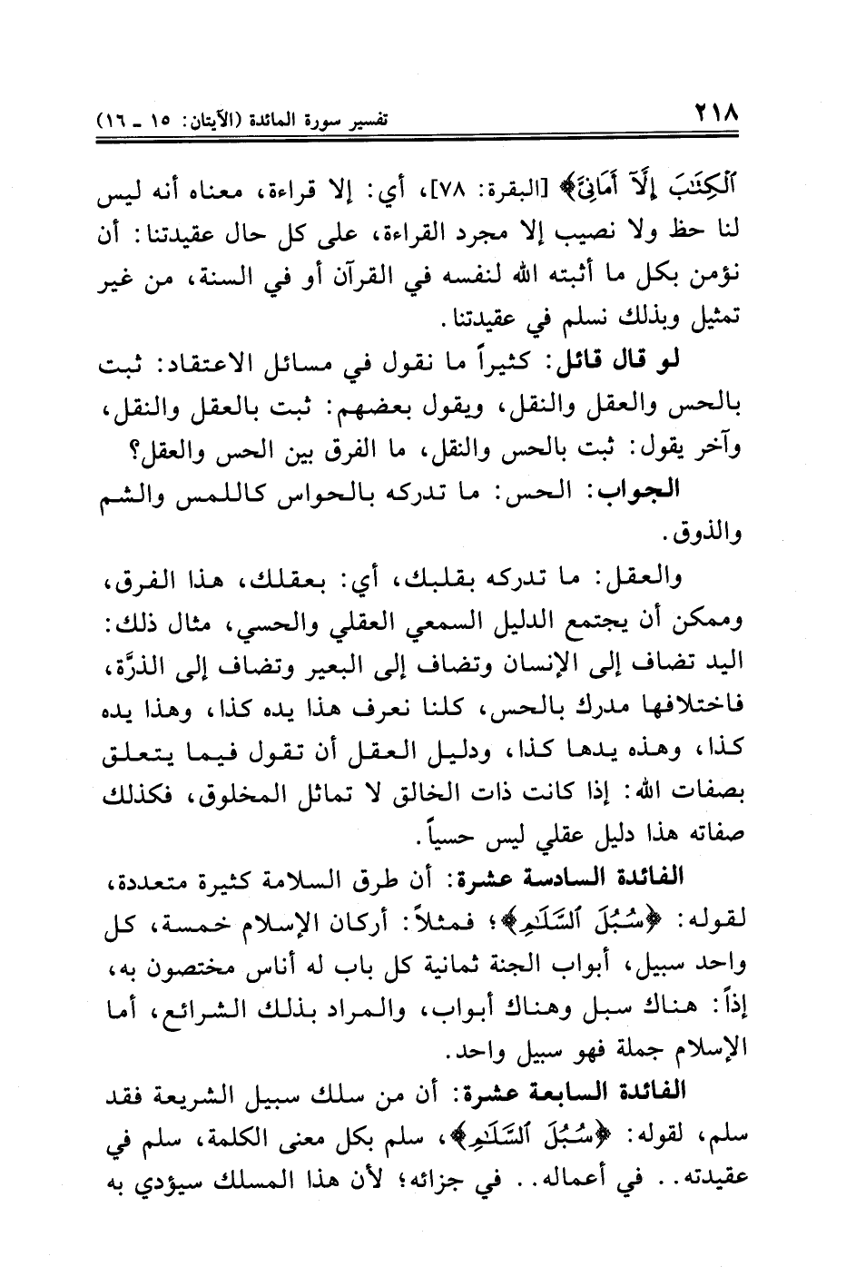 الفائدة السادسة عشرة: أن طرق السلامة كثيرة متعددة، لقوله: {سُبُلَ السَّلَامِ}؛ فمثلًا: أركان الإسلام خمسة، كل واحد سبيل، أبواب الجنة ثمانية كل باب له أناس مختصون به، إذًا: هناك سبل وهناك أبواب، والمراد بذلك الشرائع، أما الإسلام جملة فهو سبيل واحد.
