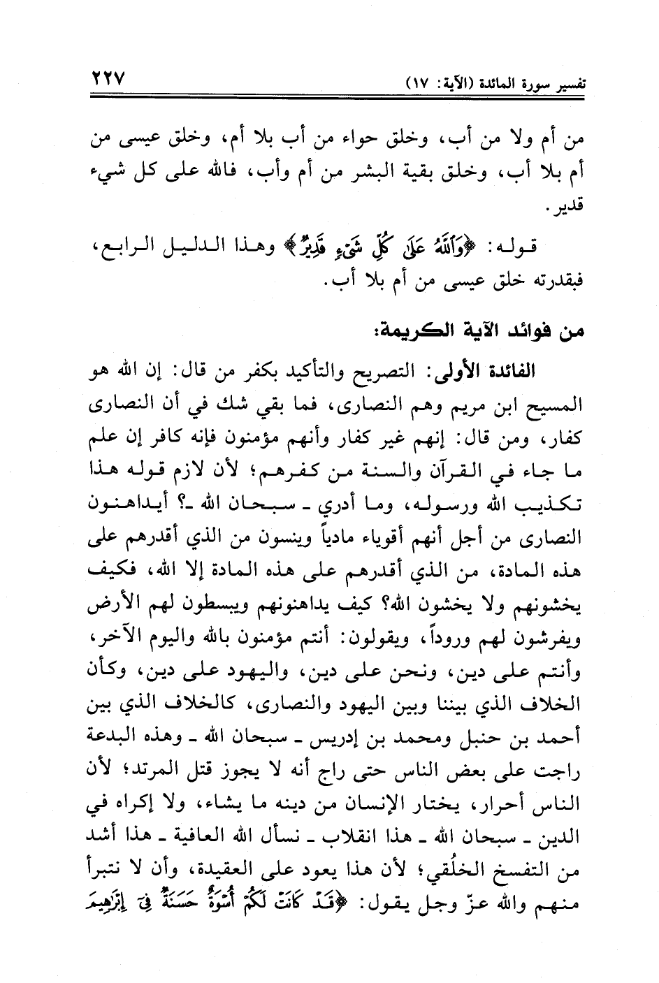 الفائدة الأولى: التصريح والتأكيد بكفر من قال: إن الله هو المسيح ابن مريم وهم النصارى، فما بقي شك في أن النصارى كفار، ومن قال: إنهم غير كفار وأنهم مؤمنون فإنه كافر إن علم ما جاء في القرآن والسنة من كفرهم؛ لأن لازم قوله هذا تكذيب الله ورسوله، وما أدري -سبحان الله-؟ أيداهنون النصارى من أجل أنهم أقوياء ماديًا وينسون من الذي أقدرهم على هذه المادة، من الذي أقدرهم على هذه المادة إلا الله، فكيف يخشونهم ولا يخشون الله؟ كيف يداهنونهم ويبسطون لهم الأرض ويفرشون لهم ورودًا، ويقولون: أنتم مؤمنون بالله واليوم الآخر، وأنتم على دين، ونحن على دين، واليهود على دين، وكأن الخلاف الذي بيننا وبين اليهود والنصارى، كالخلاف الذي بين أحمد بن حنبل ومحمد بن إدريس - سبحان الله - وهذه البدعة راجت على بعض الناس حتى راج أنه لا يجوز قتل المرتد؛ لأن الناس أحرار، يختار الإنسان من دينه ما يشاء، ولا إكراه في الدين -سبحان الله- هذا انقلاب -نسأل الله العافية- هذا أشد من التفسخ الخلُقي؛ لأن هذا يعود على العقيدة، وأن لا نتبرأ منهم والله عزّ وجل يقول: {قَدْ كَانَتْ لَكُمْ أُسْوَةٌ حَسَنَةٌ فِي إِبْرَاهِيمَ