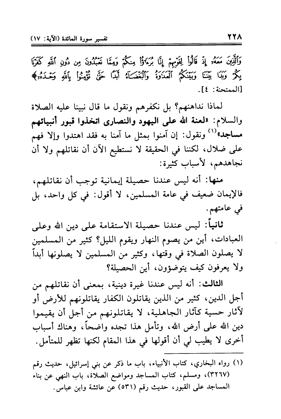 لماذا نداهنهم؟ بل نكفرهم ونقول ما قال نبينا عليه الصلاة والسلام: العنة الله على اليهود والنصارى اتخذوا قبور أنبيائهم مساجد" (¬١) ونقول: إن آمنوا بمثل ما اَمنا به فقد اهتدوا وإلا فهم طى ضلال، لكننا في الحقيقة لا نستطيع الآن أن نقاتلهم ولا أن نجاهدهم، لأسباب كثيرة: