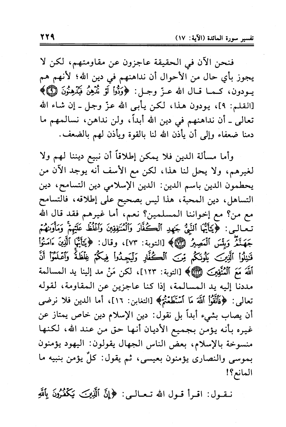 وأما مسألة الدين فلا يمكن إطلاقًا أن نبيع ديننا لهم ولا لغيرهم، ولا يحل لنا هذا، لكن مع الأسف أنه يوجد الآن من يحطمون الدين باسم الدين: الدين الإسلامي دين التسامح، دين التساهل، دين المحبة، هذا ليس بصحيح على إطلاقه، فالتسامح مع من؟ مع إخواننا المسلمين؟ نعم، أما غيرهم فقد قال الله تعالى: {يَاأَيُّهَا النَّبِيُّ جَاهِدِ الْكُفَّارَ وَالْمُنَافِقِينَ وَاغْلُظْ عَلَيْهِمْ وَمَأْوَاهُمْ جَهَنَّمُ وَبِئْسَ الْمَصِيرُ (٧٣)} [التوبة: ٧٣]، وقال: {يَاأَيُّهَا الَّذِينَ آمَنُوا قَاتِلُوا الَّذِينَ يَلُونَكُمْ مِنَ الْكُفَّارِ وَلْيَجِدُوا فِيكُمْ غِلْظَةً وَاعْلَمُوا أَنَّ اللَّهَ مَعَ الْمُتَّقِينَ (١٢٣)} [التوبة: ١٢٣]، لكن مَنْ مد إلينا يد المسالمة مددنا إليه يد المسالمة، إذا كنا عاجزين عن المقاومة، لقوله تعالى: {فَاتَّقُوا اللَّهَ مَا اسْتَطَعْتُمْ} [التغابن: ١٦]، أما الدين فلا نرضى أن يصاب بشيء أبدًا بل نقول: دين الإسلام دين خاص يمتاز عن غيره بأنه يؤمن بجميع الأديان أنها حق من عند الله، لكنها منسوخة بالإسلام، بعض الناس الجهال يقولون: اليهود يؤمنون بموسى والنصارى يؤمنون بعيسى، ثم يقول: كلٌ يؤمن بنبيه ما المانع؟ !