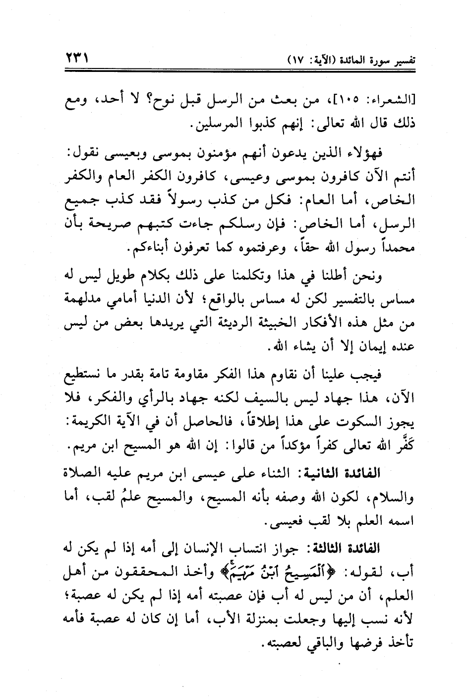 فيجب علينا أن نقاوم هذا الفكر مقاومة تامة بقدر ما نستطيع الآن، هذا جهاد ليس بالسيف لكنه جهاد بالرأي والفكر، فلا يجوز السكوت على هذا إطلاقًا، فالحاصل أن في الآية الكريمة: كَفَّر الله تعالى كفرًا مؤكدًا من قالوا: إن الله هو المسيح ابن مريم.