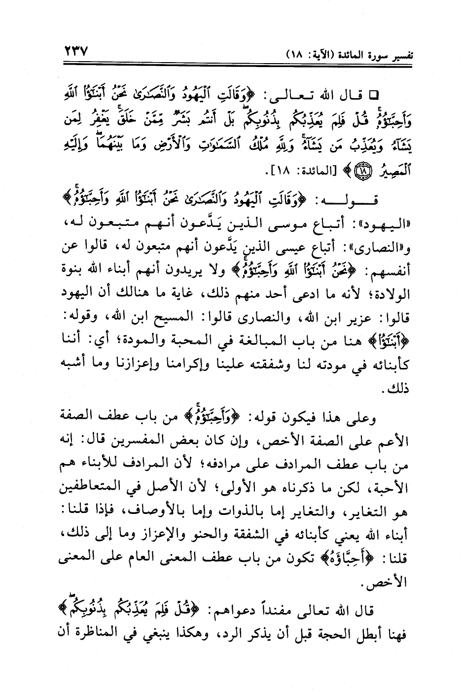 قوله: {وَقَالَتِ الْيَهُودُ وَالنَّصَارَى نَحْنُ أَبْنَاءُ اللَّهِ وَأَحِبَّاؤُهُ} "اليهود": أتباع موسى الذين يَدَّعون أنهم متبعون له، و"النصارى": أتباع عيسى الذين يَدَّعون أنهم متبعون له، قالوا عن أنفسهم: {نَحْنُ أَبْنَاءُ اللَّهِ وَأَحِبَّاؤُهُ} ولا يريدون أنهم أبناء الله بنوة الولادة؛ لأنه ما ادعى أحد منهم ذلك، غاية ما هنالك أن اليهود قالوا: عزير ابن الله، والنصارى قالوا: المسيح ابن الله، وقوله: {أَبْنَاءُ} هنا من باب المبالغة في المحبة والمودة؛ أي: أننا كأبنائه في مودته لنا وشفقته علينا وإكرامنا وإعزازنا وما أشبه ذلك.