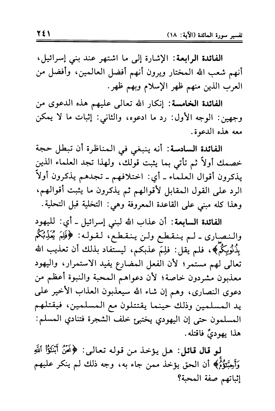 الفائدة الرابعة: الإشارة إلى ما اشتهر عند بني إسرائيل، أنهم شعب الله المختار ويرون أنهم أفضل العالمين، وأفضل من العرب الذين منهم ظهر الإسلام وبهم ظهر.