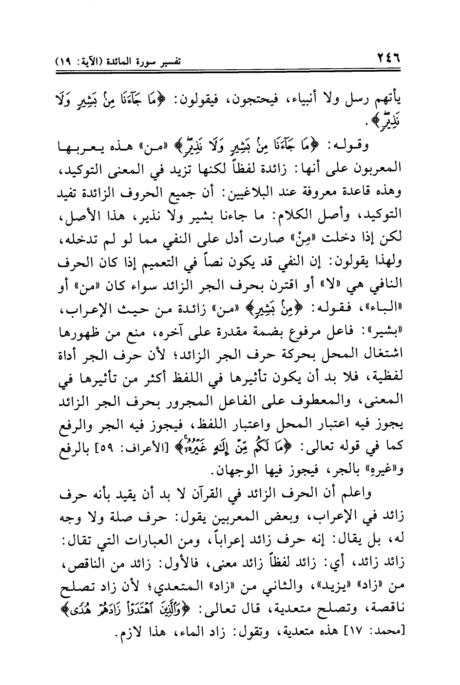 وقوله: {مَا جَاءَنَا مِنْ بَشِيرٍ وَلَا نَذِيرٍ} "من" هذه يعربها المعربون على أنها: زائدة لفظًا لكنها تزيد في المعنى التوكيد، وهذه قاعدة معروفة عند البلاغيين: أن جميع الحروف الزائدة تفيد التوكيد، وأصل الكلام: ما جاءنا بشير ولا نذير، هذا الأصل، لكن إذا دخلت "مِنْ" صارت أدل على النفي مما لو لم تدخله، ولهذا يقولون: إن النفي قد يكون نصًّا في التعميم إذا كان الحرف النافي هي "لا" أو اقترن بحرف الجر الزائد سواء كان "من" أو "الباء"، فقوله: {مِنْ بَشِير} "من" زائدة من حيث الإعراب، "بشير": فاعل مرفوع بضمة مقدرة على آخره، منع من ظهورها اشتغال المحل بحركة حرف الجر الزائد؛ لأن حرف الجر أداة لفظية، فلا بد أن يكون تأثيرها في اللفظ أكثر من تأثيرها في المعنى، والمعطوف على الفاعل المجرور بحرف الجر الزائد يجوز فيه اعتبار المحل واعتبار اللفظ، فيجوز فيه الجر والرفع كما في قوله تعالى: {مَا لَكُمْ مِنْ إِلَهٍ غَيْرُهُ} [الأعراف: ٥٩] بالرفع و"غيرهِ" بالجر، فيجوز فيها الوجهان.