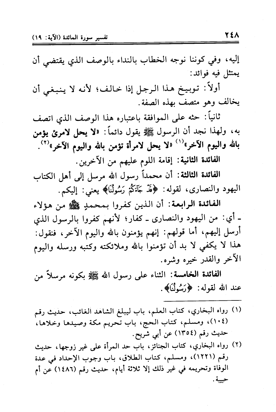 الفائدة الثالثة: أن محمدًا رسول الله مرسل إلى أهل الكتاب اليهود والنصارى، لقوله: {قَدْ جَاءَكُمْ رَسُولُنَا} يعني: إليكم.