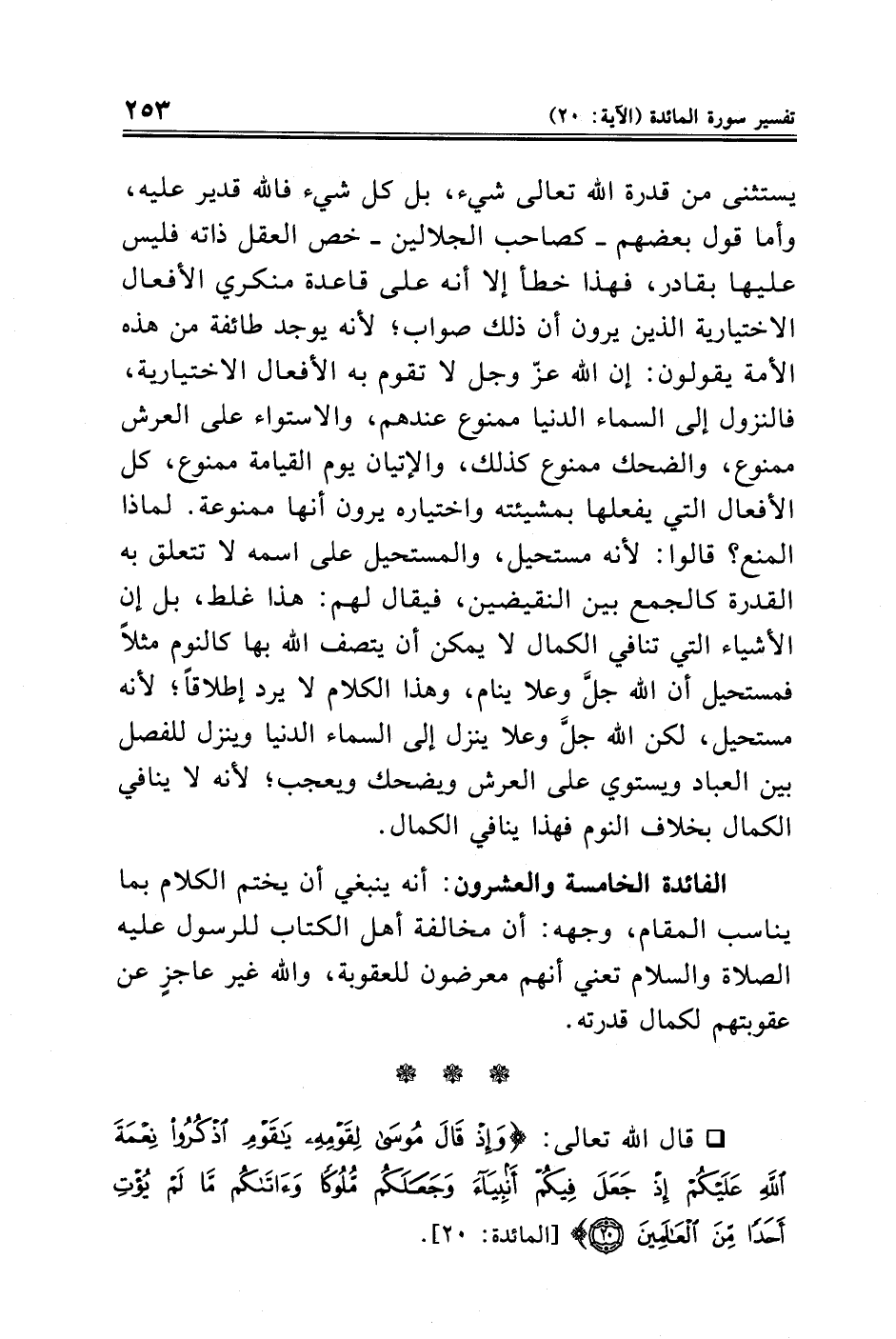 يستثنى من قدرة الله تعالى شيء، بل كل شيء فالله قدير عليه، وأما قول بعضهم - كصاحب الجلالين - خص العقل ذاته فليس عليها بقادر، فهذا خطأ إلا أنه على قاعدة منكري الأفعال الاختيارية الذين يرون أن ذلك صواب؛ لأنه يوجد طائفة من هذه الأمة يقولون: إن الله عزّ وجل لا تقوم به الأفعال الاختيارية، فالنزول إلى السماء الدنيا ممنوع عندهم، والاستواء على العرش ممنوع، والضحك ممنوع كذلك، والإتيان يوم القيامة ممنوع، كل الأفعال التي يفعلها بمشيئته واختياره يرون أنها ممنوعة. لماذا المنع؟ قالوا: لأنه مستحيل، والمستحيل على اسمه لا تتعلق به القدرة كالجمع بين النقيضين، فيقال لهم: هذا غلط، بل إن الأشياء التي تنافي الكمال لا يمكن أن يتصف الله بها كالنوم مثلًا فمستحيل أن الله جلَّ وعلا ينام، وهذا الكلام لا يرد إطلاقًا؛ لأنه مستحيل، لكن الله جلَّ وعلا ينزل إلى السماء الدنيا وينزل للفصل بين العباد ويساوي على العرش ويضحك ويعجب؛ لأنه لا ينافي الكمال بخلاف النوم فهذا ينافي الكمال.