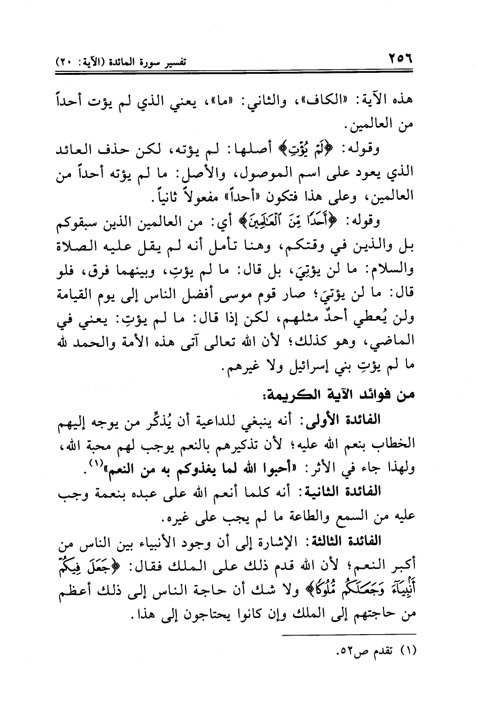 الفائدة الثالثة: الإشارة إلى أن وجود الأنبياء بين الناس من أكبر النعم؛ لأن الله قدم ذلك على الملك فقال: {جَعَلَ فِيكُمْ أَنْبِيَاءَ وَجَعَلَكُمْ مُلُوكًا} ولا شك أن حاجة الناس إلى ذلك أعظم من حاجتهم إلى الملك وإن كانوا يحتاجون إلى هذا.