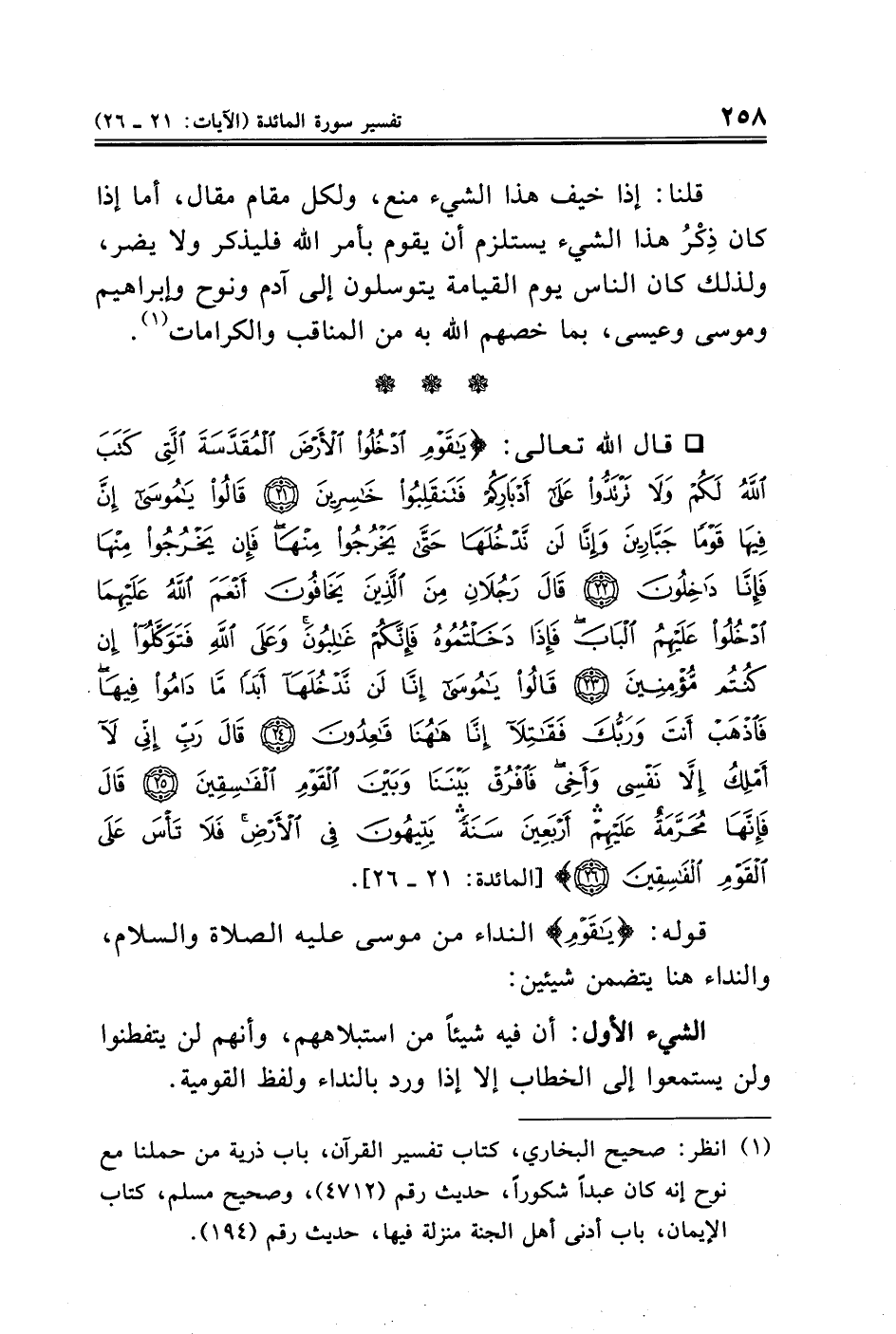 ° قال الله تعالى: {يَاقَوْمِ ادْخُلُوا الْأَرْضَ الْمُقَدَّسَةَ الَّتِي كَتَبَ اللَّهُ لَكُمْ وَلَا تَرْتَدُّوا عَلَى أَدْبَارِكُمْ فَتَنْقَلِبُوا خَاسِرِينَ (٢١) قَالُوا يَامُوسَى إِنَّ فِيهَا قَوْمًا جَبَّارِينَ وَإِنَّا لَنْ نَدْخُلَهَا حَتَّى يَخْرُجُوا مِنْهَا فَإِنْ يَخْرُجُوا مِنْهَا فَإِنَّا دَاخِلُونَ (٢٢) قَالَ رَجُلَانِ مِنَ الَّذِينَ يَخَافُونَ أَنْعَمَ اللَّهُ عَلَيْهِمَا ادْخُلُوا عَلَيْهِمُ الْبَابَ فَإِذَا دَخَلْتُمُوهُ فَإِنَّكُمْ غَالِبُونَ وَعَلَى اللَّهِ فَتَوَكَّلُوا إِنْ كُنْتُمْ مُؤْمِنِينَ (٢٣) قَالُوا يَامُوسَى إِنَّا لَنْ نَدْخُلَهَا أَبَدًا مَا دَامُوا فِيهَا فَاذْهَبْ أَنْتَ وَرَبُّكَ فَقَاتِلَا إِنَّا هَاهُنَا قَاعِدُونَ (٢٤) قَالَ رَبِّ إِنِّي لَا أَمْلِكُ إِلَّا نَفْسِي وَأَخِي فَافْرُقْ بَيْنَنَا وَبَيْنَ الْقَوْمِ الْفَاسِقِينَ (٢٥) قَالَ فَإِنَّهَا مُحَرَّمَةٌ عَلَيْهِمْ أَرْبَعِينَ سَنَةً يَتِيهُونَ فِي الْأَرْضِ فَلَا تَأْسَ عَلَى الْقَوْمِ الْفَاسِقِينَ (٢٦)} [المائدة: ٢١ - ٢٦].