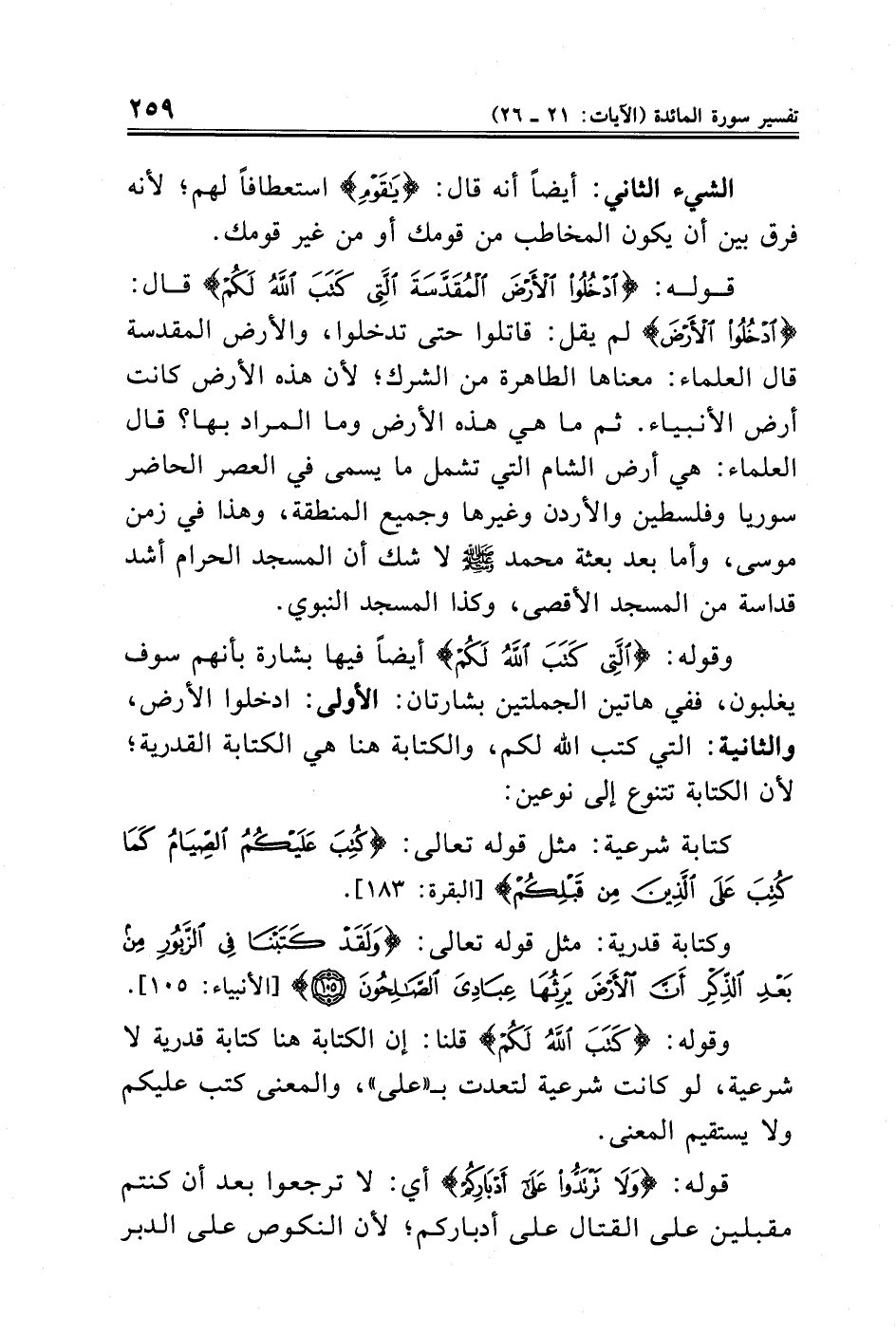قوله: {ادْخُلُوا الْأَرْضَ الْمُقَدَّسَةَ الَّتِي كَتَبَ اللَّهُ لَكُمْ} قال: {ادْخُلُوا الْأَرْضَ} لم يقل: قاتلوا حتى تدخلوا، والأرض المقدسة قال العلماء: معناها الطاهرة من الشرك؛ لأن هذه الأرض كانت أرض الأنبياء. ثم ما هي هذه الأرض وما المراد بها؟ قال العلماء: هي أرض الشام التي تشمل ما يسمى في العصر الحاضر سوريا وفلسطين والأردن وغيرها وجميع المنطقة، وهذا في زمن موسى، وأما بعد بعثة محمَّد - صلى الله عليه وسلم - لا شك أن المسجد الحرام أشد قداسة من المسجد الأقصى، وكذا المسجد النبوي.