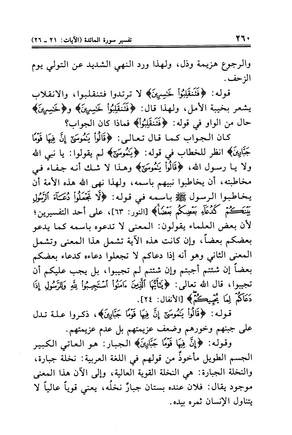 قوله: {فَتَنْقَلِبُوا خَاسِرِينَ} لا ترتدوا فتنقلبوا، والانقلاب يشعر بخيبة الأمل، ولهذا قال: {فَتَنْقَلِبُوا خَاسِرِينَ} و {خَاسِرِينَ} حال من الواو في قوله: {فَتَنْقَلِبُوا} فماذا كان الجواب؟