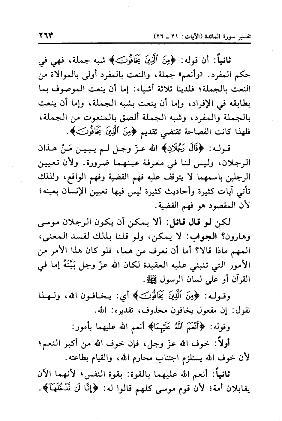 لكن لو قال قائل: ألا يمكن أن يكون الرجلان موسى وهارون؟ الجواب: لا يمكن، ولو قلنا بذلك لفسد المعنى، المهم ماذا قالا؟ أما أن نعرف من هما، فلو كان هذا الأمر من الأمور التي تنبني عليه العقيدة لكان الله عَزَّ وَجَلَّ بَيَّنَهُ إما في القرآن أو على لسان الرسول - صلى الله عليه وسلم -.