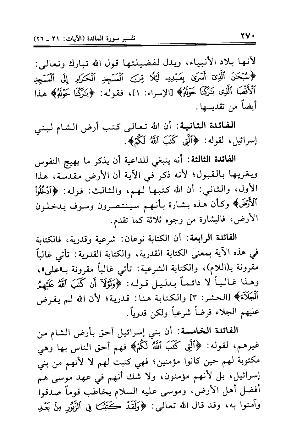الفائدة الخامسة: أن بني إسرائيل أحق بأرض الشام من غيرهم، لقوله: {الَّتِي كَتَبَ اللَّهُ لَكُمْ} فهم أحق الناس بها وهي مكتوبة لهم حين كانوا مؤمنين؛ فهي كتبت لهم لا لأنهم من بني إسرائيل، بل لأنهم مؤمنون، ولا شك أنهم في عهد موسى هم أفضل أهل الأرض، وموسى عليه السلام يخاطب قومًا صدقوا وآمنوا به، وقد قال الله تعالى: {وَلَقَدْ كَتَبْنَا فِي الزَّبُورِ مِنْ بَعْدِ